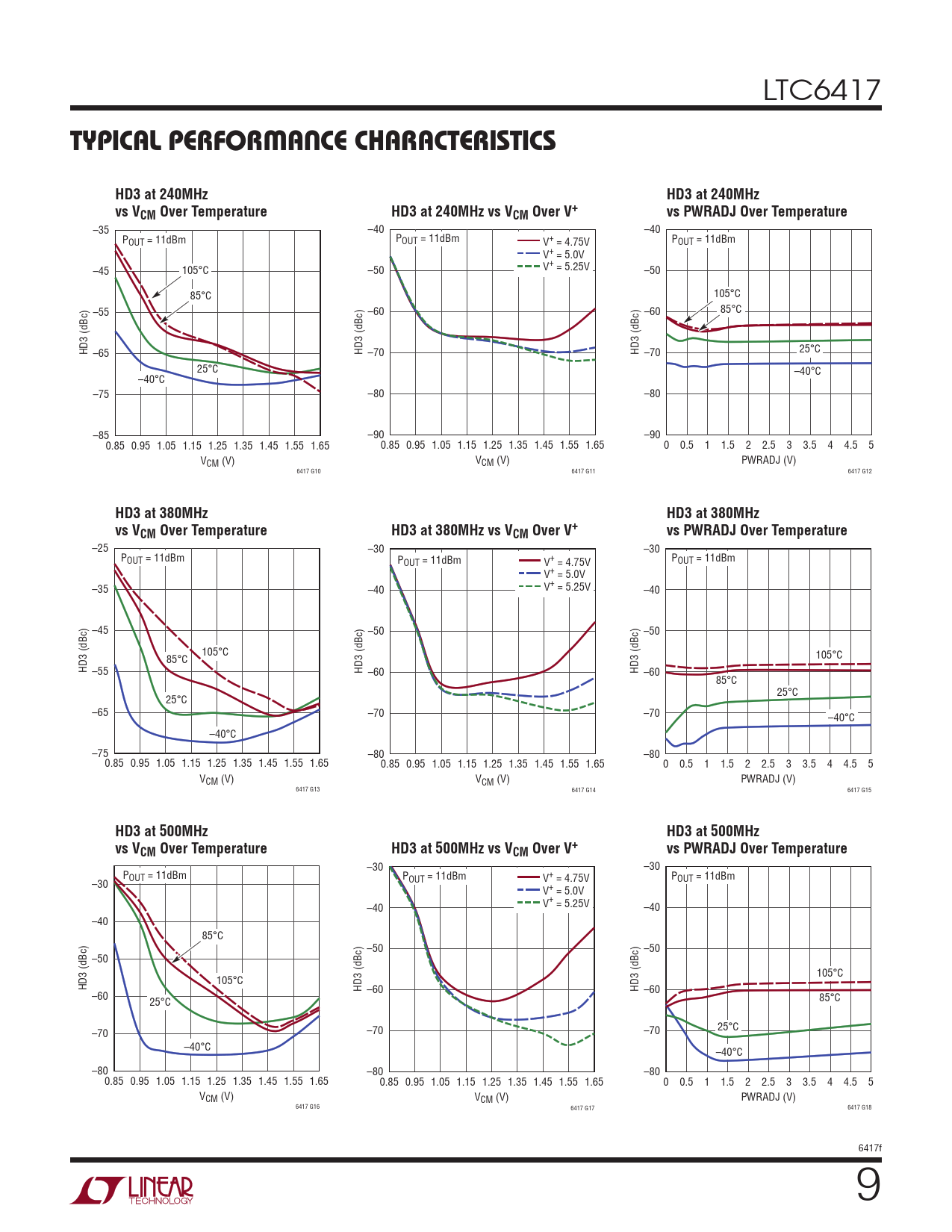 –35 –40 –40 POUT = 11dBm POUT = 11dBm V+ = 4.75V POUT = 11dBm V+ = 5.0V –45 105°C –50 V+ = 5.25V –50 85°C 105°C –55 –60 –60 85°C HD3 (dBc) –65 HD3 (dBc) –70 HD3 (dBc) –70 25°C 25°C –40°C –40°C –75 –80 –80 –85 –90 –90 0.85 0.95 1.05 1.15 1.25 1.35 1.45 1.55 1.65 0.85 0.95 1.05 1.15 1.25 1.35 1.45 1.55 1.65 0 0.5 1 1.5 2 2.5 3 3.5 4 4.5 5 VCM (V) VCM (V) PWRADJ (V) 6417 G10 6417 G11 6417 G12
