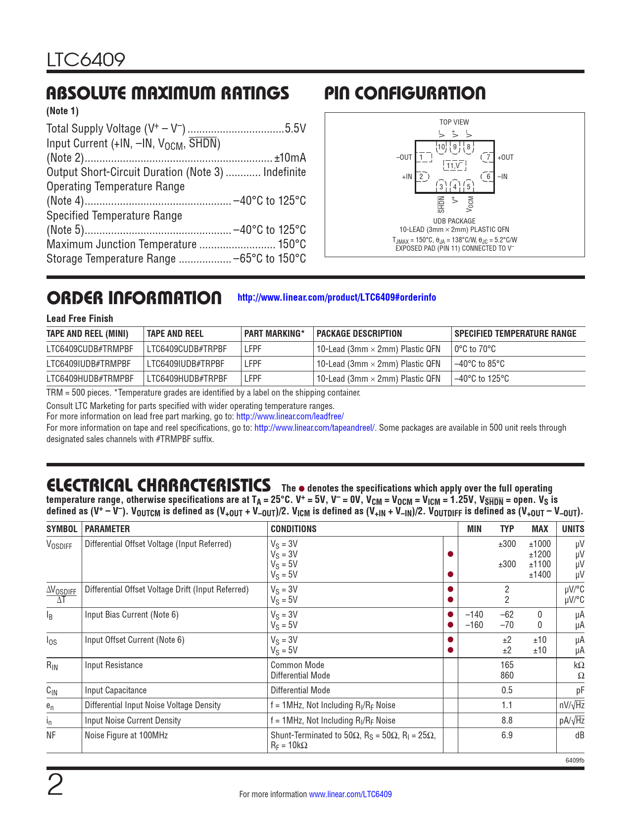 ABSOLUTE MAXIMUM RATINGS PIN CONFIGURATION (Note 1) ORDER INFORMATION http://www.linear.com/product/LTC6409#orderinfo