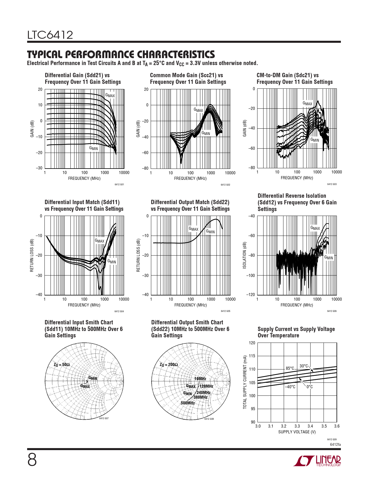 LTC6412 TYPICAL PERFORMANCE CHARACTERISTICS Electrical Performance in Test Circuits A and B at TA = 25°C and VCC = 3.3V unless otherwise noted.Differential Gain (Sdd21) vsCommon Mode Gain (Scc21) vsCM-to-DM Gain (Sdc21) vsFrequency Over 11 Gain SettingsFrequency Over 11 Gain SettingsFrequency Over 11 Gain Settings 20 20 0 GMAX 10 0 GMAX G –20 MAX 0 –20 –40 GMIN GAIN (dB) –10 GAIN (dB) –40 GAIN (dB) GMIN GMIN –60 –20 –60 –30 –80 –80 1 10 100 1000 10000 1 10 100 1000 10000 1 10 100 1000 10000 FREQUENCY (MHz) FREQUENCY (MHz) FREQUENCY (MHz) 6412 G01 6412 G02 6412 G03 Differential Reverse IsolationDifferential Input Match (Sdd11)Differential Output Match (Sdd22)(Sdd12) vs Frequency Over 6 Gainvs Frequency Over 11 Gain Settingsvs Frequency Over 11 Gain SettingsSettings 0 0 –40 G G MAX MAX GMIN –10 –10 –60 GMAX –20 –20 TION (dB) –80 GMIN GMIN ISOLA RETURN LOSS (dB) RETURN LOSS (dB) –30 –30 –100 –40 –40 –120 1 10 100 1000 10000 1 10 100 1000 10000 1 10 100 1000 10000 FREQUENCY (MHz) FREQUENCY (MHz) FREQUENCY (MHz) 6412 G04 6412 G05 6412 G06 Differential Input Smith ChartDifferential Output Smith Chart(Sdd11) 10MHz to 500MHz Over 6(Sdd22) 10MHz to 500MHz Over 6Supply Current vs Supply VoltageGain SettingsGain SettingsOver Temperature 120 115 ZO = 50ΩZO = 200Ω 30°C 110 85°C GMIN10MHz 105 GMAXGMAX 120MHz –40°C 0°C GMIN240MHz380MHz 100 500MHz TOTAL SUPPLY CURRENT (mA) 95 6412 G07 6412 G08 903.0 3.1 3.2 3.3 3.4 3.5 3.6 SUPPLY VOLTAGE (V) 6412 G09 6412fa 8