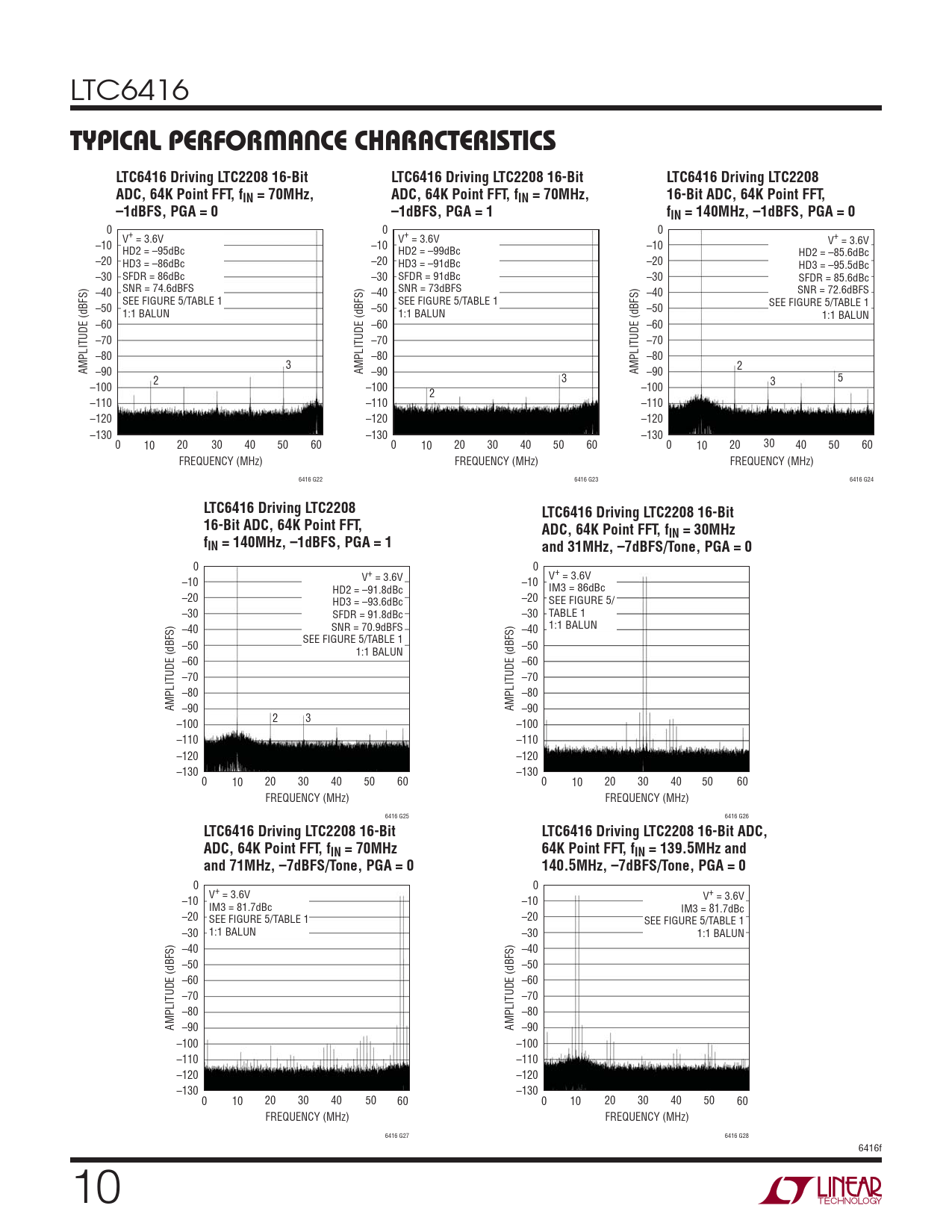 TYPICAL PERFORMANCE CHARACTERISTICS LTC6416 Driving LTC2208 16-Bit LTC6416 Driving LTC2208 16-Bit LTC6416 Driving LTC2208 ADC, 64K Point FFT, fIN = 70MHz, ADC, 64K Point FFT, fIN = 70MHz, 16-Bit ADC, 64K Point FFT, –1dBFS, PGA = 0 –1dBFS, PGA = 1 fIN = 140MHz, –1dBFS, PGA = 0