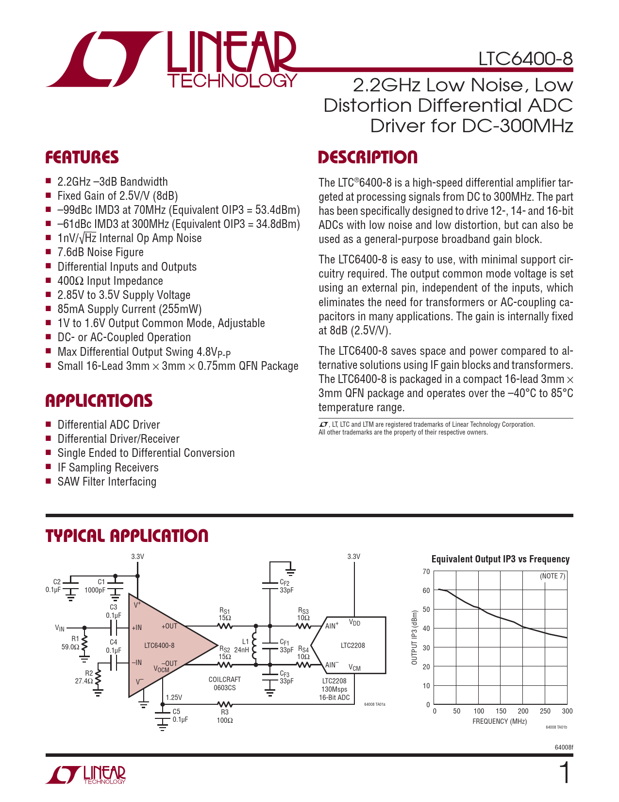 LTC6400-8 2.2GHz Low Noise, Low Distortion Differential ADC Driver for DC-300MHz FEATURESDESCRIPTION n 2.2GHz –3dB Bandwidth The LTC®6400-8 is a high-speed differential amplifi er tar- n Fixed Gain of 2.5V/V (8dB) geted at processing signals from DC to 300MHz. The part n –99dBc IMD3 at 70MHz (Equivalent OIP3 = 53.4dBm) has been specifi cally designed to drive 12-, 14- and 16-bit n –61dBc IMD3 at 300MHz (Equivalent OIP3 = 34.8dBm) ADCs with low noise and low distortion, but can also be n 1nV/√Hz Internal Op Amp Noise used as a general-purpose broadband gain block. n 7.6dB Noise Figure The LTC6400-8 is easy to use, with minimal support cir- n Differential Inputs and Outputs cuitry required. The output common mode voltage is set n 400Ω Input Impedance using an external pin, independent of the inputs, which n 2.85V to 3.5V Supply Voltage eliminates the need for transformers or AC-coupling ca- n 85mA Supply Current (255mW) pacitors in many applications. The gain is internally fi xed n 1V to 1.6V Output Common Mode, Adjustable at 8dB (2.5V/V). n DC- or AC-Coupled Operation n Max Differential Output Swing 4.8V The LTC6400-8 saves space and power compared to al- P-P n Small 16-Lead 3mm × 3mm × 0.75mm QFN Package ternative solutions using IF gain blocks and transformers. The LTC6400-8 is packaged in a compact 16-lead 3mm × APPLICATIONS 3mm QFN package and operates over the –40°C to 85°C temperature range. n Differential ADC Driver L, LT, LTC and LTM are registered trademarks of Linear Technology Corporation. All other trademarks are the property of their respective owners. n Differential Driver/Receiver n Single Ended to Differential Conversion n IF Sampling Receivers n SAW Filter Interfacing TYPICAL APPLICATION 3.3V 3.3V Equivalent Output IP3 vs Frequency 70 (NOTE 7) C2 C1 CF2 0.1μF 1000pF 33pF 60 C3 V+ R R 50 S1 S3 0.1μF 15Ω 10Ω VDD V AIN+ IN +IN +OUT 40 R1 C4 L1 C 59.0Ω LTC6400-8 F1 LTC2208 R 24nH 33pF R 30 0.1μF S2 S4 15Ω 10Ω –IN –OUT OUTPUT IP3 (dBm) AIN– V 20 V CM R2 OCM CF3 27.4Ω COILCRAFT V– 33pF LTC2208 10 0603CS 130Msps 1.25V 16-Bit ADC 64008 TA01a 0 C5 R3 0 50 100 150 200 250 300 0.1μF 100Ω FREQUENCY (MHz) 64008 TA01b 64008f 1
