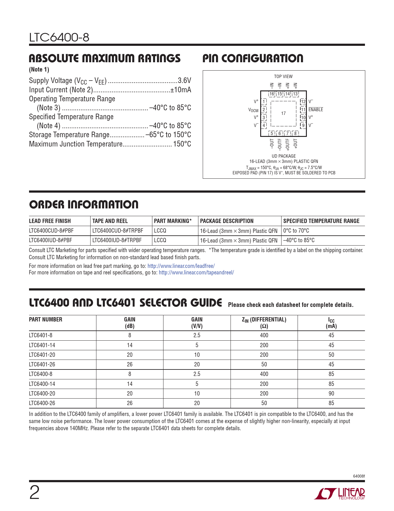 LTC6400-8 ABSOLUTE MAXIMUM RATINGSPIN CONFIGURATION(Note 1) TOP VIEW Supply Voltage (VCC – VEE) ..3.6V Input Current (Note 2) ..±10mA –IN –IN +IN +IN 16 15 14 13 Operating Temperature Range V+ 1 12 V– (Note 3) ... –40°C to 85°C V 2 11 OCM ENABLE Specifi ed Temperature Range 17 V+ 3 10 V+ (Note 4) ... –40°C to 85°C V– 4 9 V– Storage Temperature Range ... –65°C to 150°C 5 6 7 8 Maximum Junction Temperature... 150°C –OUT –OUTF +OUTF +OUT UD PACKAGE 16-LEAD (3mm s 3mm) PLASTIC QFN TJMAX = 150°C, θJA = 68°C/W, θJC = 7.5°C/W EXPOSED PAD (PIN 17) IS V–, MUST BE SOLDERED TO PCB ORDER INFORMATIONLEAD FREE FINISHTAPE AND REELPART MARKING*PACKAGE DESCRIPTIONSPECIFIED TEMPERATURE RANGE LTC6400CUD-8#PBF LTC6400CUD-8#TRPBF LCCQ 16-Lead (3mm × 3mm) Plastic QFN 0°C to 70°C LTC6400IUD-8#PBF LTC6400IUD-8#TRPBF LCCQ 16-Lead (3mm × 3mm) Plastic QFN –40°C to 85°C Consult LTC Marketing for parts specifi ed with wider operating temperature ranges. *The temperature grade is identifi ed by a label on the shipping container. Consult LTC Marketing for information on non-standard lead based fi nish parts. For more information on lead free part marking, go to: http://www.linear.com/leadfree/ For more information on tape and reel specifi cations, go to: http://www.linear.com/tapeandreel/ LTC6400 AND LTC6401 SELECTOR GUIDE Please check each datasheet for complete details.PART NUMBERGAINGAINZIN (DIFFERENTIAL)ICC(dB)(V/V)(Ω)(mA) LTC6401-8 8 2.5 400 45 LTC6401-14 14 5 200 45 LTC6401-20 20 10 200 50 LTC6401-26 26 20 50 45 LTC6400-8 8 2.5 400 85 LTC6400-14 14 5 200 85 LTC6400-20 20 10 200 90 LTC6400-26 26 20 50 85 In addition to the LTC6400 family of amplifi ers, a lower power LTC6401 family is available. The LTC6401 is pin compatible to the LTC6400, and has the same low noise performance. The lower power consumption of the LTC6401 comes at the expense of slightly higher non-linearity, especially at input frequencies above 140MHz. Please refer to the separate LTC6401 data sheets for complete details. 64008f 2