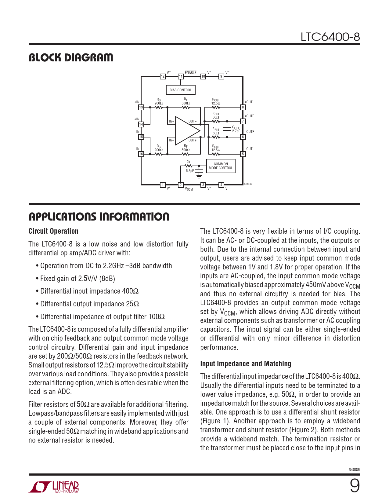 LTC6400-8 BLOCK DIAGRAM V– ENABLE V+ V– 12 11 10 9 BIAS CONTROL RG RF ROUT +IN +OUT 200Ω 500Ω 12.5Ω 13 8 RFILT +OUTF 50Ω +IN IN+ OUT– 7 14 C R FILT FILT –IN 2.7pF –OUTF 50Ω 15 6 IN– OUT+ RG RF ROUT –IN –OUT 200Ω 500Ω 12.5Ω 16 5 2k COMMON MODE CONTROL 5.3pF 64008 BD 1 2 3 4 V+ VOCM V+ V– APPLICATIONS INFORMATIONCircuit Operation The LTC6400-8 is very fl exible in terms of I/O coupling. It can be AC- or DC-coupled at the inputs, the outputs or The LTC6400-8 is a low noise and low distortion fully both. Due to the internal connection between input and differential op amp/ADC driver with: output, users are advised to keep input common mode • Operation from DC to 2.2GHz –3dB bandwidth voltage between 1V and 1.8V for proper operation. If the • Fixed gain of 2.5V/V (8dB) inputs are AC-coupled, the input common mode voltage is automatically biased approximately 450mV above VOCM • Differential input impedance 400Ω and thus no external circuitry is needed for bias. The • Differential output impedance 25Ω LTC6400-8 provides an output common mode voltage set by V • Differential impedance of output fi lter 100Ω OCM, which allows driving ADC directly without external components such as transformer or AC coupling The LTC6400-8 is composed of a fully differential amplifi er capacitors. The input signal can be either single-ended with on chip feedback and output common mode voltage or differential with only minor difference in distortion control circuitry. Differential gain and input impedance performance. are set by 200Ω/500Ω resistors in the feedback network. Small output resistors of 12.5Ω improve the circuit stability Input Impedance and Matching over various load conditions. They also provide a possible The differential input impedance of the LTC6400-8 is 400Ω. external fi ltering option, which is often desirable when the Usually the differential inputs need to be terminated to a load is an ADC. lower value impedance, e.g. 50Ω, in order to provide an Filter resistors of 50Ω are available for additional fi ltering. impedance match for the source. Several choices are avail- Lowpass/bandpass fi lters are easily implemented with just able. One approach is to use a differential shunt resistor a couple of external components. Moreover, they offer (Figure 1). Another approach is to employ a wideband single-ended 50Ω matching in wideband applications and transformer and shunt resistor (Figure 2). Both methods no external resistor is needed. provide a wideband match. The termination resistor or the transformer must be placed close to the input pins in 64008f 9