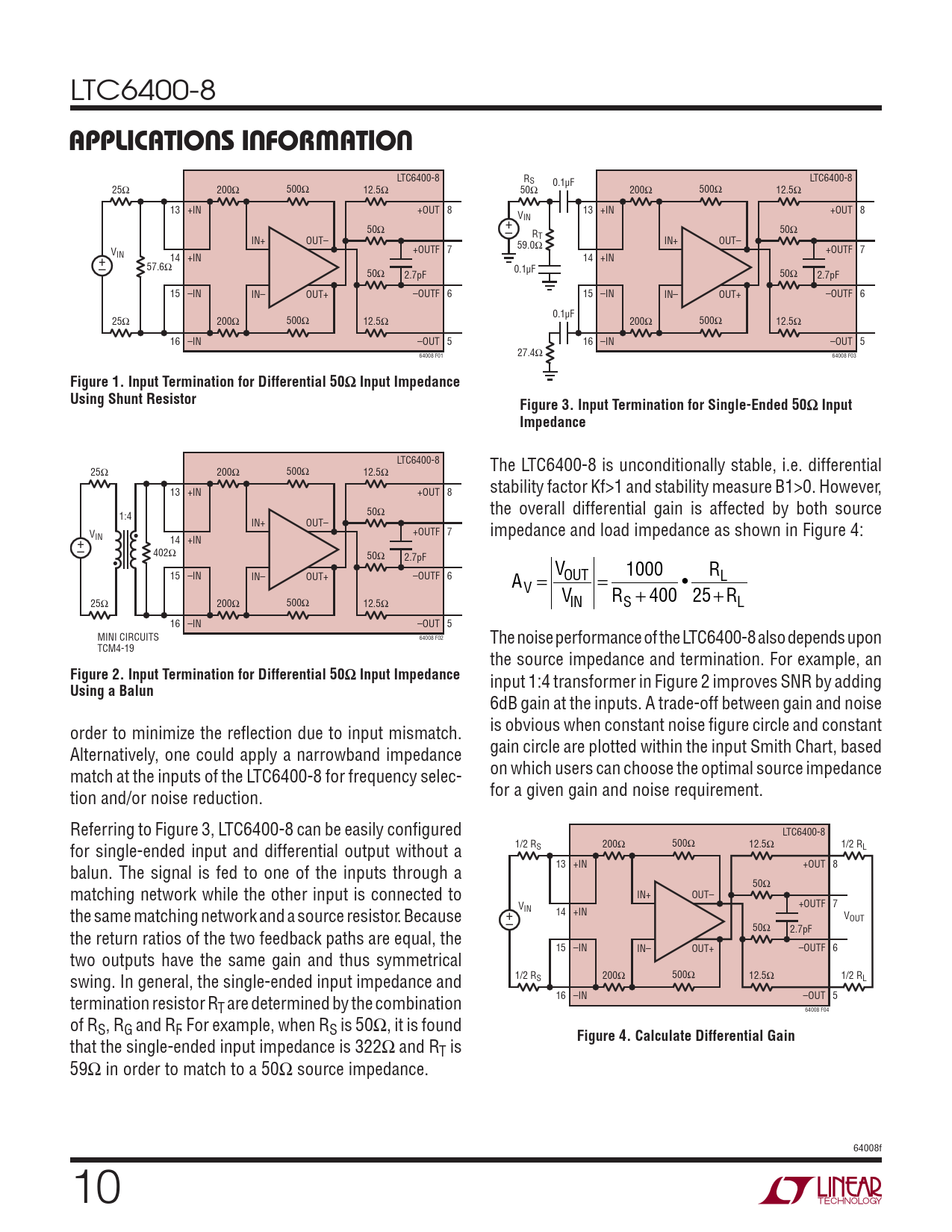 LTC6400-8 APPLICATIONS INFORMATION LTC6400-8 RS 0.1μF LTC6400-8 25Ω 200Ω 500Ω 12.5Ω 50Ω 200Ω 500Ω 12.5Ω 13 +IN +OUT 8 13 +IN +OUT 8 VIN + 50Ω – R 50Ω T IN+ OUT– IN+ OUT– 59.0Ω +OUTF 7 +OUTF 7 VIN 14 +IN 14 +IN + 57.6Ω – 0.1μF 50Ω 2.7pF 50Ω 2.7pF 15 –IN IN– OUT+ –OUTF 6 15 –IN IN– OUT+ –OUTF 6 0.1μF 25Ω 200Ω 500Ω 12.5Ω 200Ω 500Ω 12.5Ω 16 –IN –OUT 5 16 –IN –OUT 5 64008 F01 27.4Ω 64008 F03 Figure 1. Input Termination for Differential 50Ω Input Impedance Using Shunt ResistorFigure 3. Input Termination for Single-Ended 50Ω Input Impedance LTC6400-8 25Ω 500Ω The LTC6400-8 is unconditionally stable, i.e. differential 200Ω 12.5Ω 13 +IN +OUT 8 stability factor Kf>1 and stability measure B1>0. However, 50Ω the overall differential gain is affected by both source 1:4 IN+ OUT– +OUTF V 7 IN • impedance and load impedance as shown in Figure 4: 14 +IN + – 402Ω • 50Ω 2.7pF V 1000 R 15 –IN IN– OUT+ –OUTF 6 A OUT L V = = • V R 25Ω 200Ω 500Ω 12.5Ω + 400 25+R IN S L 16 –IN –OUT 5 MINI CIRCUITS 64008 F02 The noise performance of the LTC6400-8 also depends upon TCM4-19 the source impedance and termination. For example, an Figure 2. Input Termination for Differential 50Ω Input Impedance input 1:4 transformer in Figure 2 improves SNR by adding Using a Balun 6dB gain at the inputs. A trade-off between gain and noise is obvious when constant noise fi gure circle and constant order to minimize the refl ection due to input mismatch. gain circle are plotted within the input Smith Chart, based Alternatively, one could apply a narrowband impedance on which users can choose the optimal source impedance match at the inputs of the LTC6400-8 for frequency selec- for a given gain and noise requirement. tion and/or noise reduction. Referring to Figure 3, LTC6400-8 can be easily confi gured LTC6400-8 1/2 R 200Ω 500Ω 12.5Ω S 1/2 RL for single-ended input and differential output without a 13 +IN +OUT 8 balun. The signal is fed to one of the inputs through a 50Ω IN+ OUT– matching network while the other input is connected to +OUTF V 7 IN 14 +IN + VOUT the same matching network and a source resistor. Because – 50Ω 2.7pF the return ratios of the two feedback paths are equal, the 15 –IN IN– OUT+ –OUTF 6 two outputs have the same gain and thus symmetrical 1/2 R 200Ω S 500Ω 12.5Ω 1/2 RL swing. In general, the single-ended input impedance and 16 –IN –OUT 5 termination resistor R 64008 F04 T are determined by the combination of RS, RG and RF. For example, when RS is 50Ω, it is found Figure 4. Calculate Differential Gain that the single-ended input impedance is 322Ω and RT is 59Ω in order to match to a 50Ω source impedance. 64008f 10