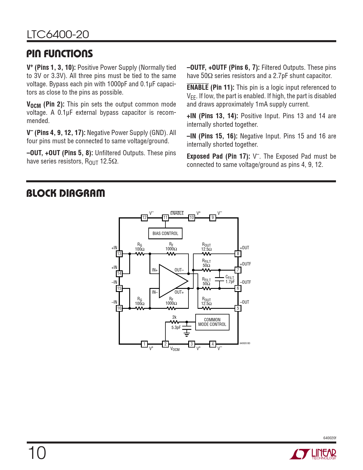 V– ENABLE V+ V– 12 11 10 9 BIAS CONTROL RG RF ROUT +IN +OUT 100Ω 1000Ω 12.5Ω 13 8 RFILT +OUTF 50Ω +IN IN+ OUT– 7 14 C R FILT FILT –IN 1.7pF –OUTF 50Ω 15 6 IN– OUT+ RG RF ROUT –IN –OUT 100Ω 1000Ω 12.5Ω 16 5 2k COMMON MODE CONTROL 5.3pF 640020 BD 1 2 3 4 V+ VOCM V+ V– 640020f 10