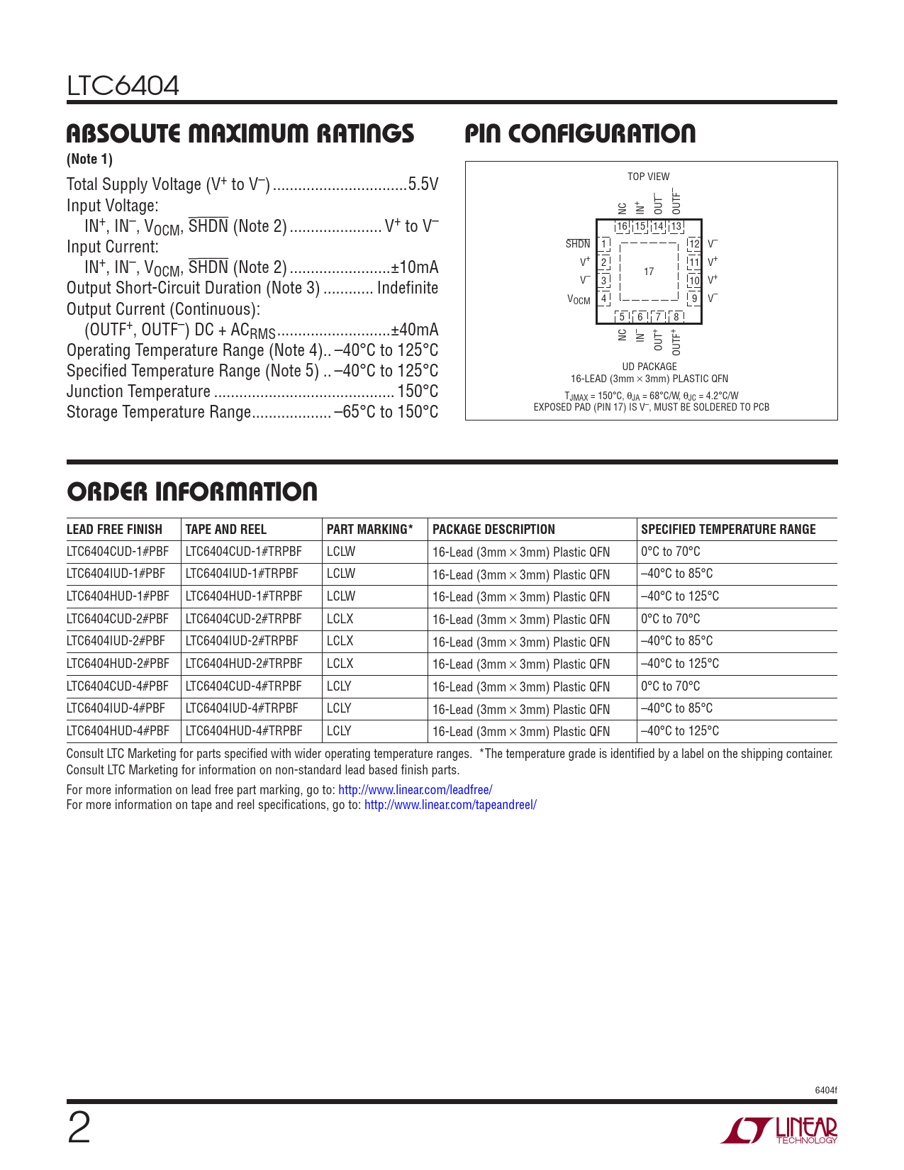 LTC6404CUD-1#PBF LTC6404CUD-1#TRPBF LCLW 16-Lead (3mm × 3mm) Plastic QFN 0°C to 70°C LTC6404IUD-1#PBF LTC6404IUD-1#TRPBF LCLW 16-Lead (3mm × 3mm) Plastic QFN –40°C to 85°C LTC6404HUD-1#PBF LTC6404HUD-1#TRPBF LCLW 16-Lead (3mm × 3mm) Plastic QFN –40°C to 125°C LTC6404CUD-2#PBF LTC6404CUD-2#TRPBF LCLX 16-Lead (3mm × 3mm) Plastic QFN 0°C to 70°C LTC6404IUD-2#PBF LTC6404IUD-2#TRPBF LCLX 16-Lead (3mm × 3mm) Plastic QFN –40°C to 85°C LTC6404HUD-2#PBF LTC6404HUD-2#TRPBF LCLX 16-Lead (3mm × 3mm) Plastic QFN –40°C to 125°C LTC6404CUD-4#PBF LTC6404CUD-4#TRPBF LCLY 16-Lead (3mm × 3mm) Plastic QFN 0°C to 70°C LTC6404IUD-4#PBF LTC6404IUD-4#TRPBF LCLY 16-Lead (3mm × 3mm) Plastic QFN –40°C to 85°C LTC6404HUD-4#PBF LTC6404HUD-4#TRPBF LCLY 16-Lead (3mm × 3mm) Plastic QFN –40°C to 125°C Consult LTC Marketing for parts specifi ed with wider operating temperature ranges. *The temperature grade is identifi ed by a label on the shipping container. Consult LTC Marketing for information on non-standard lead based fi nish parts. For more information on lead free part marking, go to: http://www.linear.com/leadfree/ For more information on tape and reel specifi cations, go to: http://www.linear.com/tapeandreel/ 6404f 2
