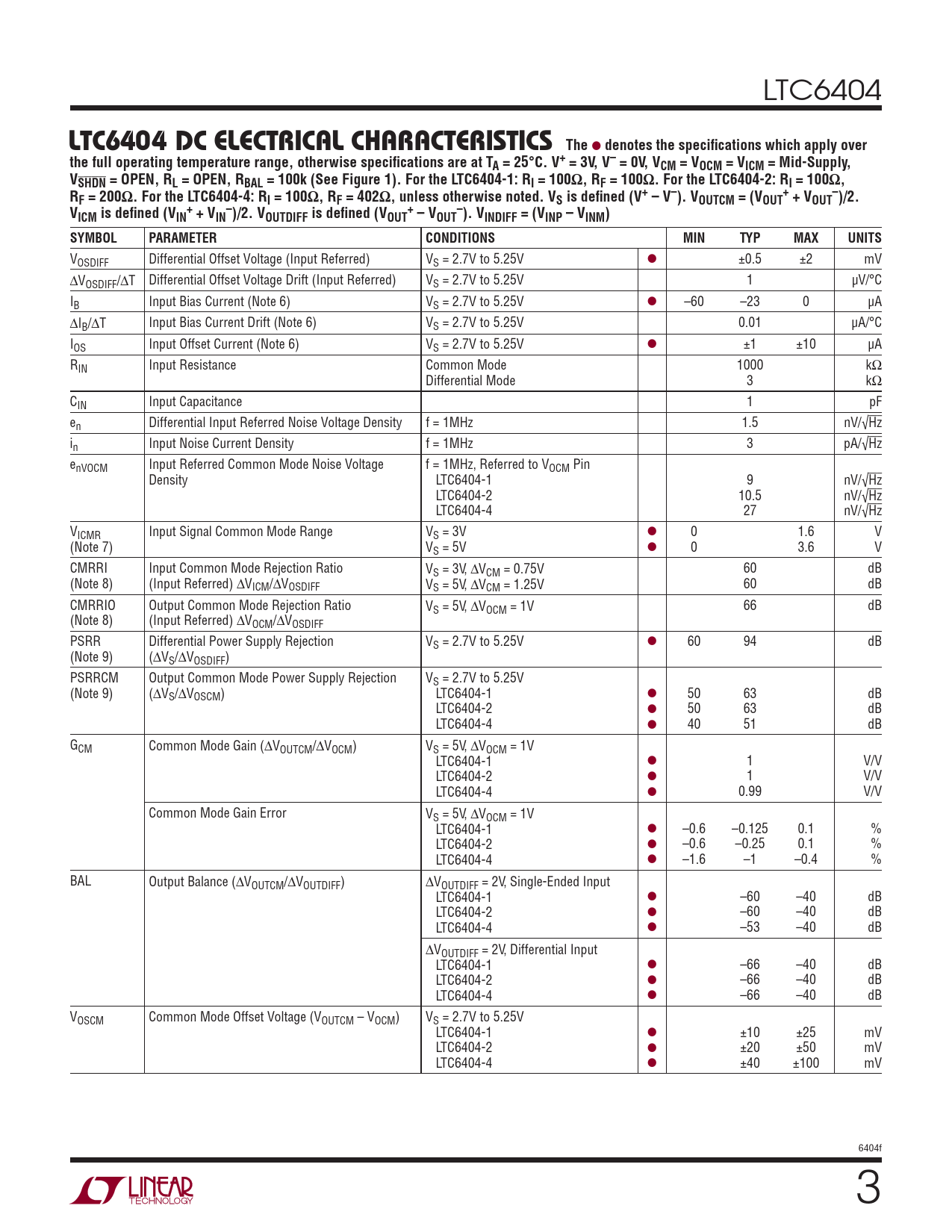 LTC6404 LTC6404 DC ELECTRICAL CHARACTERISTICS The l denotes the specifi cations which apply overthe full operating temperature range, otherwise specifi cations are at TA = 25°C. V+ = 3V, V– = 0V, VCM = VOCM = VICM = Mid-Supply,VSHDN = OPEN, RL = OPEN, RBAL = 100k (See Figure 1). For the LTC6404-1: RI = 100Ω, RF = 100Ω. For the LTC6404-2: RI = 100Ω,R+–F = 200Ω. For the LTC6404-4: RI = 100Ω, RF = 402Ω, unless otherwise noted. VS is defi ned (V+ – V–). VOUTCM = (VOUT + VOUT )/2.V+–+–ICM is defi ned (VIN + VIN )/2. VOUTDIFF is defi ned (VOUT – VOUT ). VINDIFF = (VINP – VINM)SYMBOLPARAMETERCONDITIONSMINTYPMAXUNITS VOSDIFF Differential Offset Voltage (Input Referred) VS = 2.7V to 5.25V l ±0.5 ±2 mV ΔVOSDIFF/ΔT Differential Offset Voltage Drift (Input Referred) VS = 2.7V to 5.25V 1 μV/°C IB Input Bias Current (Note 6) VS = 2.7V to 5.25V l –60 –23 0 μA ΔIB/ΔT Input Bias Current Drift (Note 6) VS = 2.7V to 5.25V 0.01 μA/°C IOS Input Offset Current (Note 6) VS = 2.7V to 5.25V l ±1 ±10 μA RIN Input Resistance Common Mode 1000 kΩ Differential Mode 3 kΩ CIN Input Capacitance 1 pF en Differential Input Referred Noise Voltage Density f = 1MHz 1.5 nV/√Hz in Input Noise Current Density f = 1MHz 3 pA/√Hz enVOCM Input Referred Common Mode Noise Voltage f = 1MHz, Referred to VOCM Pin Density LTC6404-1 9 nV/√Hz LTC6404-2 10.5 nV/√Hz LTC6404-4 27 nV/√Hz VICMR Input Signal Common Mode Range VS = 3V l 0 1.6 V (Note 7) VS = 5V l 0 3.6 V CMRRI Input Common Mode Rejection Ratio VS = 3V, ΔVCM = 0.75V 60 dB (Note 8) (Input Referred) ΔVICM/ΔVOSDIFF VS = 5V, ΔVCM = 1.25V 60 dB CMRRIO Output Common Mode Rejection Ratio VS = 5V, ΔVOCM = 1V 66 dB (Note 8) (Input Referred) ΔVOCM/ΔVOSDIFF PSRR Differential Power Supply Rejection VS = 2.7V to 5.25V l 60 94 dB (Note 9) (ΔVS/ΔVOSDIFF) PSRRCM Output Common Mode Power Supply Rejection VS = 2.7V to 5.25V (Note 9) (ΔVS/ΔVOSCM) LTC6404-1 l 50 63 dB LTC6404-2 l 50 63 dB LTC6404-4 l 40 51 dB GCM Common Mode Gain (ΔVOUTCM/ΔVOCM) VS = 5V, ΔVOCM = 1V LTC6404-1 l 1 V/V LTC6404-2 l 1 V/V LTC6404-4 l 0.99 V/V Common Mode Gain Error VS = 5V, ΔVOCM = 1V LTC6404-1 l –0.6 –0.125 0.1 % LTC6404-2 l –0.6 –0.25 0.1 % LTC6404-4 l –1.6 –1 –0.4 % BAL Output Balance (ΔVOUTCM/ΔVOUTDIFF) ΔVOUTDIFF = 2V, Single-Ended Input LTC6404-1 l –60 –40 dB LTC6404-2 l –60 –40 dB LTC6404-4 l –53 –40 dB ΔVOUTDIFF = 2V, Differential Input LTC6404-1 l –66 –40 dB LTC6404-2 l –66 –40 dB LTC6404-4 l –66 –40 dB VOSCM Common Mode Offset Voltage (VOUTCM – VOCM) VS = 2.7V to 5.25V LTC6404-1 l ±10 ±25 mV LTC6404-2 l ±20 ±50 mV LTC6404-4 l ±40 ±100 mV 6404f 3