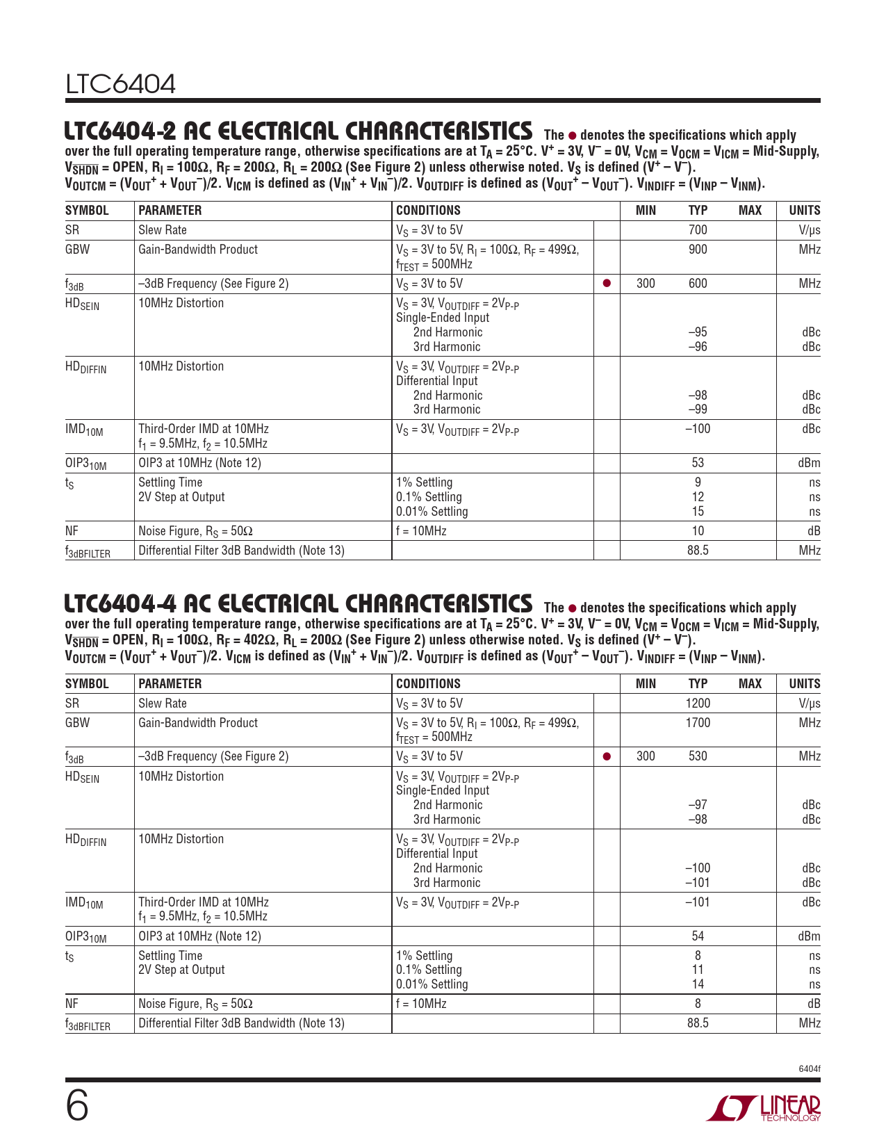 SR Slew Rate VS = 3V to 5V 1200 V/μs GBW Gain-Bandwidth Product VS = 3V to 5V, RI = 100Ω, RF = 499Ω, 1700 MHz fTEST = 500MHz f3dB –3dB Frequency (See Figure 2) VS = 3V to 5V l 300 530 MHz HDSEIN 10MHz Distortion VS = 3V, VOUTDIFF = 2VP-P Single-Ended Input 2nd Harmonic –97 dBc 3rd Harmonic –98 dBc HDDIFFIN 10MHz Distortion VS = 3V, VOUTDIFF = 2VP-P Differential Input 2nd Harmonic –100 dBc 3rd Harmonic –101 dBc IMD10M Third-Order IMD at 10MHz VS = 3V, VOUTDIFF = 2VP-P –101 dBc f1 = 9.5MHz, f2 = 10.5MHz OIP310M OIP3 at 10MHz (Note 12) 54 dBm tS Settling Time 1% Settling 8 ns 2V Step at Output 0.1% Settling 11 ns 0.01% Settling 14 ns NF Noise Figure, RS = 50Ω f = 10MHz 8 dB f3dBFILTER Differential Filter 3dB Bandwidth (Note 13) 88.5 MHz 6404f 6