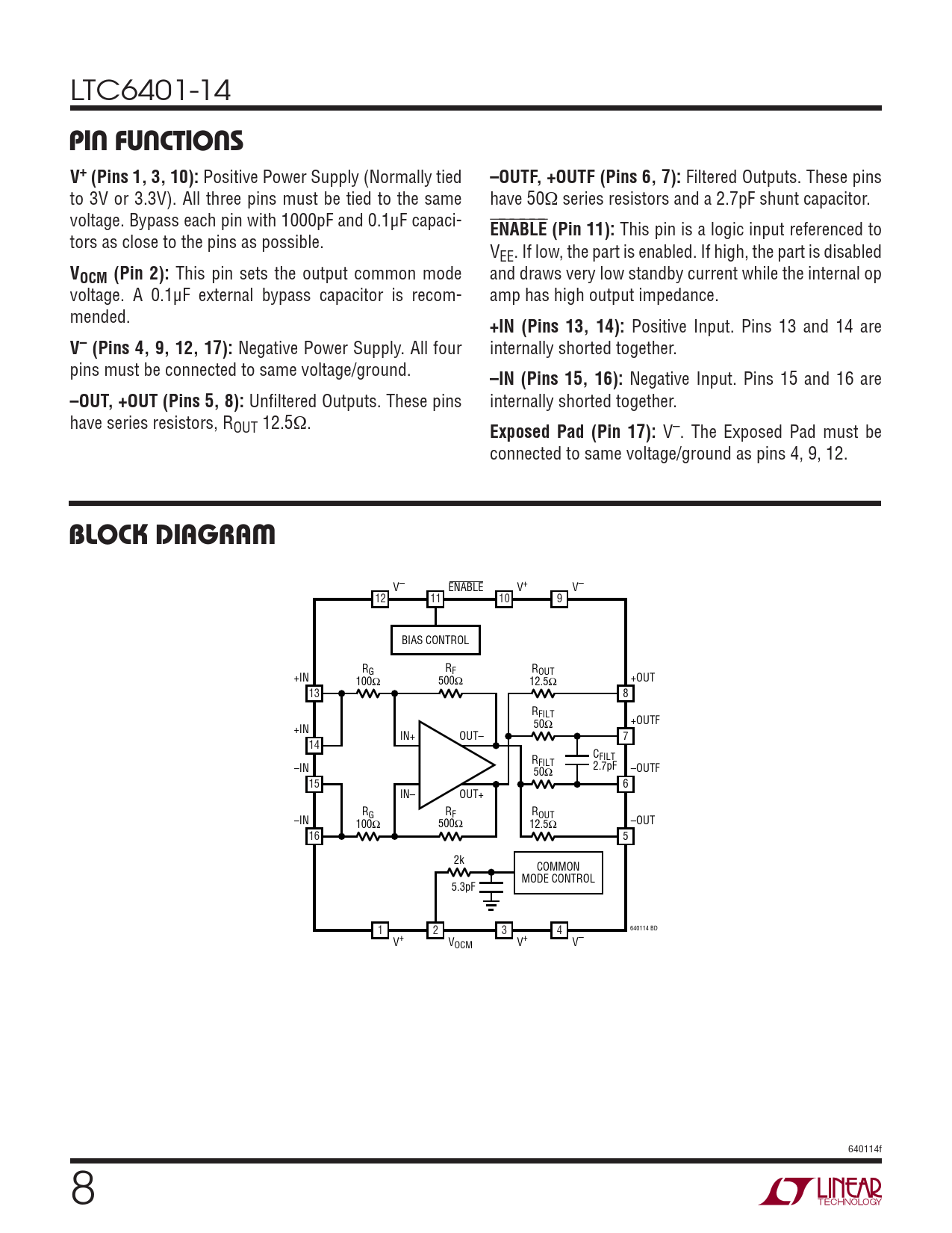 PIN FUNCTIONS. V+ (Pins 1, 3, 10):. –OUTF, +OUTF (Pins 6, 7):. E (Pin 11):. VOCM (Pin 2):. +IN (Pins 13, 14):