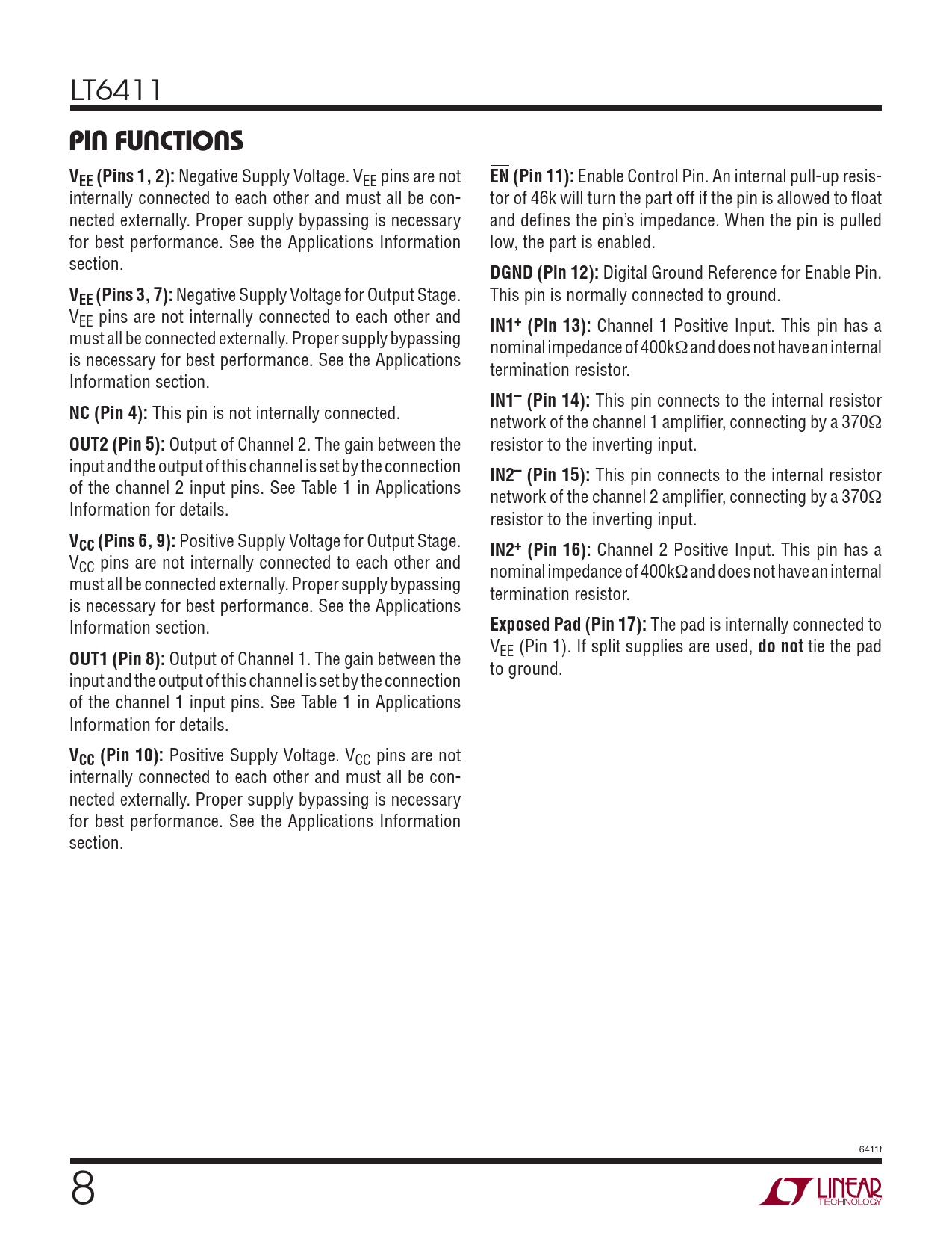 Positive Supply Voltage. VCC pins are not internally connected to each other and must all be con- nected externally. Proper supply bypassing is necessary for best performance. See the Applications Information section. 6411f 8