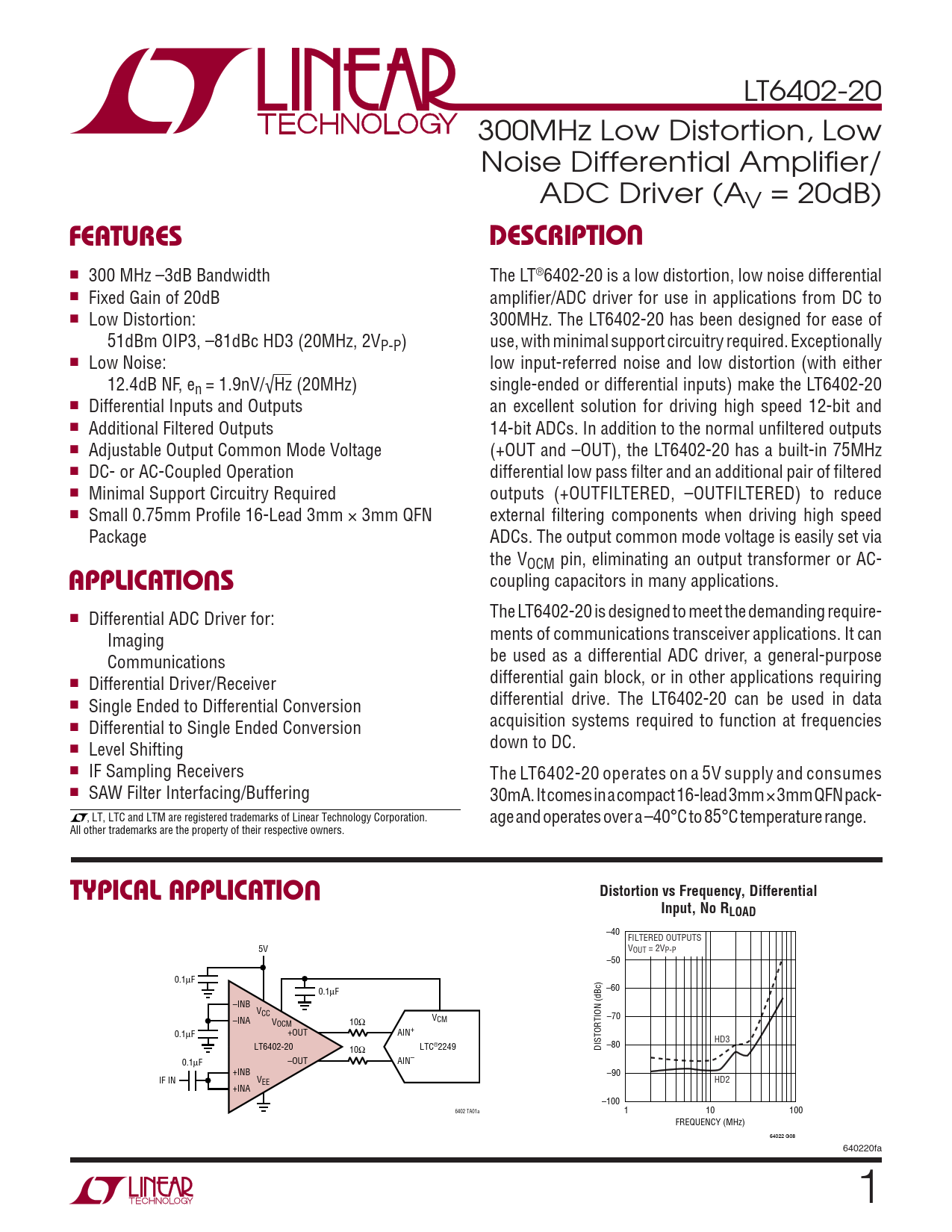 LT6402-20 300MHz Low Distortion, Low Noise Differential Amplifi er/ ADC Driver (AV = 20dB) UFEATURESDESCRIPTIO ■ 300 MHz –3dB Bandwidth The LT®6402-20 is a low distortion, low noise differential ■ Fixed Gain of 20dB amplifi er/ADC driver for use in applications from DC to ■ Low Distortion: 300MHz. The LT6402-20 has been designed for ease of 51dBm OIP3, –81dBc HD3 (20MHz, 2V use, with minimal support circuitry required. Exceptionally P-P) ■ Low Noise: low input-referred noise and low distortion (with either 12.4dB NF, e single-ended or differential inputs) make the LT6402-20 n = 1.9nV/√Hz (20MHz) ■ Differential Inputs and Outputs an excellent solution for driving high speed 12-bit and ■ Additional Filtered Outputs 14-bit ADCs. In addition to the normal unfi ltered outputs ■ Adjustable Output Common Mode Voltage (+OUT and –OUT), the LT6402-20 has a built-in 75MHz ■ DC- or AC-Coupled Operation differential low pass fi lter and an additional pair of fi ltered ■ Minimal Support Circuitry Required outputs (+OUTFILTERED, –OUTFILTERED) to reduce ■ Small 0.75mm Profi le 16-Lead 3mm × 3mm QFN external fi ltering components when driving high speed Package ADCs. The output common mode voltage is easily set via the V U OCM pin, eliminating an output transformer or AC- APPLICATIO S coupling capacitors in many applications. ■ The LT6402-20 is designed to meet the demanding require- Differential ADC Driver for: ments of communications transceiver applications. It can Imaging be used as a differential ADC driver, a general-purpose Communications ■ differential gain block, or in other applications requiring Differential Driver/Receiver ■ differential drive. The LT6402-20 can be used in data Single Ended to Differential Conversion ■ acquisition systems required to function at frequencies Differential to Single Ended Conversion ■ down to DC. Level Shifting ■ IF Sampling Receivers The LT6402-20 operates on a 5V supply and consumes ■ SAW Filter Interfacing/Buffering 30mA. It comes in a compact 16-lead 3mm × 3mm QFN pack- , LT, LTC and LTM are registered trademarks of Linear Technology Corporation. age and operates over a –40°C to 85°C temperature range. All other trademarks are the property of their respective owners. UTYPICAL APPLICATIODistortion vs Frequency, DifferentialInput, No RLOAD –40 FILTERED OUTPUTS 5V VOUT = 2VP-P –50 0.1µF 0.1µF –60 –INB VCC –INA V –70 V CM OCM 10Ω 0.1µF +OUT AIN+ HD3 LT6402-20 –80 10Ω LTC®2249 DISTORTION (dBc) 0.1µF –OUT AIN– +INB –90 IF IN VEE HD2 +INA –100 6402 TA01a 1 10 100 FREQUENCY (MHz) 64022 G08 640220fa 1