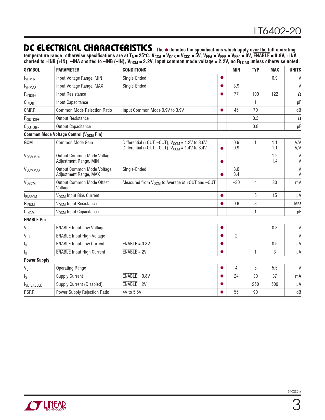 VS Operating Range ● 4 5 5.5 V IS Supply Current ⎯E⎯N⎯A⎯B⎯L⎯E = 0.8V ● 24 30 37 mA ISDISABLED Supply Current (Disabled) ⎯E⎯N⎯A⎯B⎯L⎯E = 2V ● 250 500 µA PSRR Power Supply Rejection Ratio 4V to 5.5V ● 55 90 dB 640220fa 3