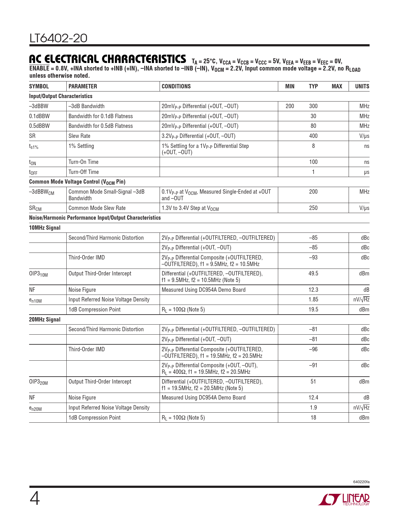 Second/Third Harmonic Distortion 2VP-P Differential (+OUTFILTERED, –OUTFILTERED) –81 dBc 2VP-P Differential (+OUT, –OUT) –81 dBc Third-Order IMD 2VP-P Differential Composite (+OUTFILTERED, –96 dBc –OUTFILTERED), f1 = 19.5MHz, f2 = 20.5MHz 2VP-P Differential Composite (+OUT, –OUT), –91 dBc RL = 400Ω, f1 = 19.5MHz, f2 = 20.5MHz OIP320M Output Third-Order Intercept Differential (+OUTFILTERED, –OUTFILTERED), 51 dBm f1 = 19.5MHz, f2 = 20.5MHz (Note 5) NF Noise Figure Measured Using DC954A Demo Board 12.4 dB en20M Input Referred Noise Voltage Density 1.9 nV/√Hz 1dB Compression Point RL = 100Ω (Note 5) 18 dBm 640220fa 4