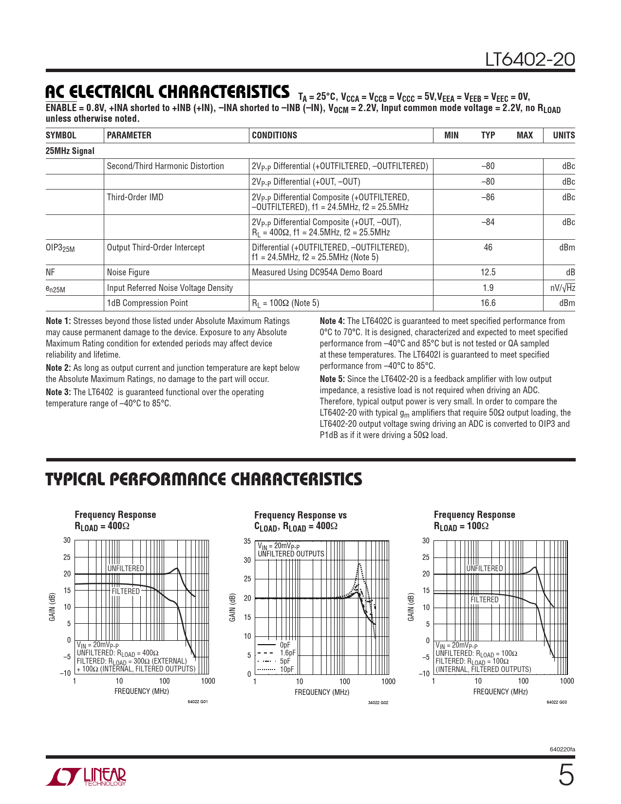 Ω 30 35 30 VIN = 20mVP-P 25 UNFILTERED OUTPUTS 30 25 UNFILTERED UNFILTERED 20 20 25 15 FILTERED 15 20 FILTERED 10 10 GAIN (dB) GAIN (dB) 15 GAIN (dB) 5 5 10 0 0 VIN = 20mVP-P 0pF VIN = 20mVP-P UNFILTERED: R 1.6pF UNFILTERED: R –5 LOAD = 400Ω 5 –5 LOAD = 100Ω FILTERED: RLOAD = 300Ω (EXTERNAL) 5pF FILTERED: RLOAD = 100Ω + 100Ω (INTERNAL, FILTERED OUTPUTS) 10pF (INTERNAL, FILTERED OUTPUTS) –10 0 –10 1 10 100 1000 1 10 100 1000 1 10 100 1000 FREQUENCY (MHz) FREQUENCY (MHz) FREQUENCY (MHz) 64022 G01 34022 G02 64022 G03 640220fa 5