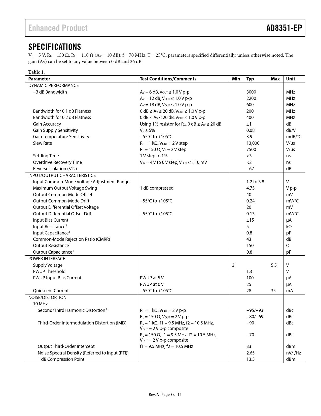 Enhanced Product. AD8351-EP. SPECIFICATIONS. Table 1. Parameter. Test Conditions/Comments. Min Typ. Max Unit