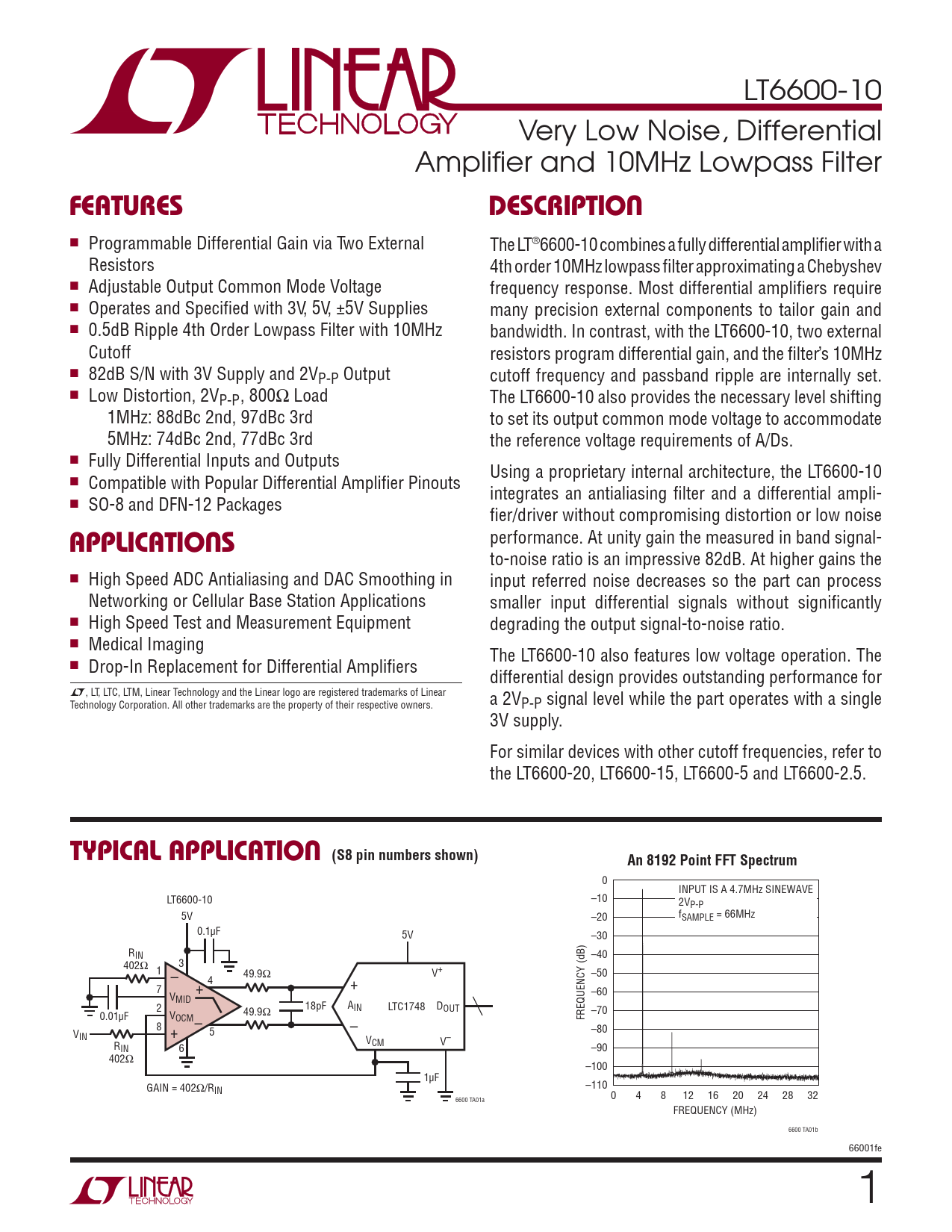 LT6600-10 Very Low Noise, Differential Amplifi er and 10MHz Lowpass Filter FEATURESDESCRIPTION n Programmable Differential Gain via Two External The LT®6600-10 combines a fully differential amplifi er with a Resistors 4th order 10MHz lowpass fi lter approximating a Chebyshev n Adjustable Output Common Mode Voltage frequency response. Most differential amplifi ers require n Operates and Specifi ed with 3V, 5V, ±5V Supplies many precision external components to tailor gain and n 0.5dB Ripple 4th Order Lowpass Filter with 10MHz bandwidth. In contrast, with the LT6600-10, two external Cutoff resistors program differential gain, and the fi lter’s 10MHz n 82dB S/N with 3V Supply and 2VP-P Output cutoff frequency and passband ripple are internally set. n Low Distortion, 2VP-P , 800Ω Load The LT6600-10 also provides the necessary level shifting 1MHz: 88dBc 2nd, 97dBc 3rd to set its output common mode voltage to accommodate 5MHz: 74dBc 2nd, 77dBc 3rd the reference voltage requirements of A/Ds. n Fully Differential Inputs and Outputs Using a proprietary internal architecture, the LT6600-10 n Compatible with Popular Differential Amplifi er Pinouts integrates an antialiasing fi lter and a differential ampli- n SO-8 and DFN-12 Packages fi er/driver without compromising distortion or low noise APPLICATIONS performance. At unity gain the measured in band signal- to-noise ratio is an impressive 82dB. At higher gains the n High Speed ADC Antialiasing and DAC Smoothing in input referred noise decreases so the part can process Networking or Cellular Base Station Applications smaller input differential signals without signifi cantly n High Speed Test and Measurement Equipment degrading the output signal-to-noise ratio. n Medical Imaging The LT6600-10 also features low voltage operation. The n Drop-In Replacement for Differential Amplifi ers differential design provides outstanding performance for L, LT, LTC, LTM, Linear Technology and the Linear logo are registered trademarks of Linear Technology Corporation. All other trademarks are the property of their respective owners. a 2VP-P signal level while the part operates with a single 3V supply. For similar devices with other cutoff frequencies, refer to the LT6600-20, LT6600-15, LT6600-5 and LT6600-2.5. TYPICAL APPLICATION (S8 pin numbers shown)An 8192 Point FFT Spectrum 0 INPUT IS A 4.7MHz SINEWAVE LT6600-10 –10 2VP-P 5V –20 fSAMPLE = 66MHz 0.1μF 5V –30 RIN –40 402Ω 3 1 49.9Ω – V+ –50 4 7 + + –60 VMID 18pF A 2 IN LTC1748 DOUT –70 0.01μF 49.9Ω VOCM FREQUENCY (dB) 8 – – –80 V 5 IN + V R CM V– IN 6 –90 402Ω –100 1μF GAIN = 402Ω/R –110 IN 0 4 8 12 16 20 24 28 32 6600 TA01a FREQUENCY (MHz) 6600 TA01b 66001fe 1