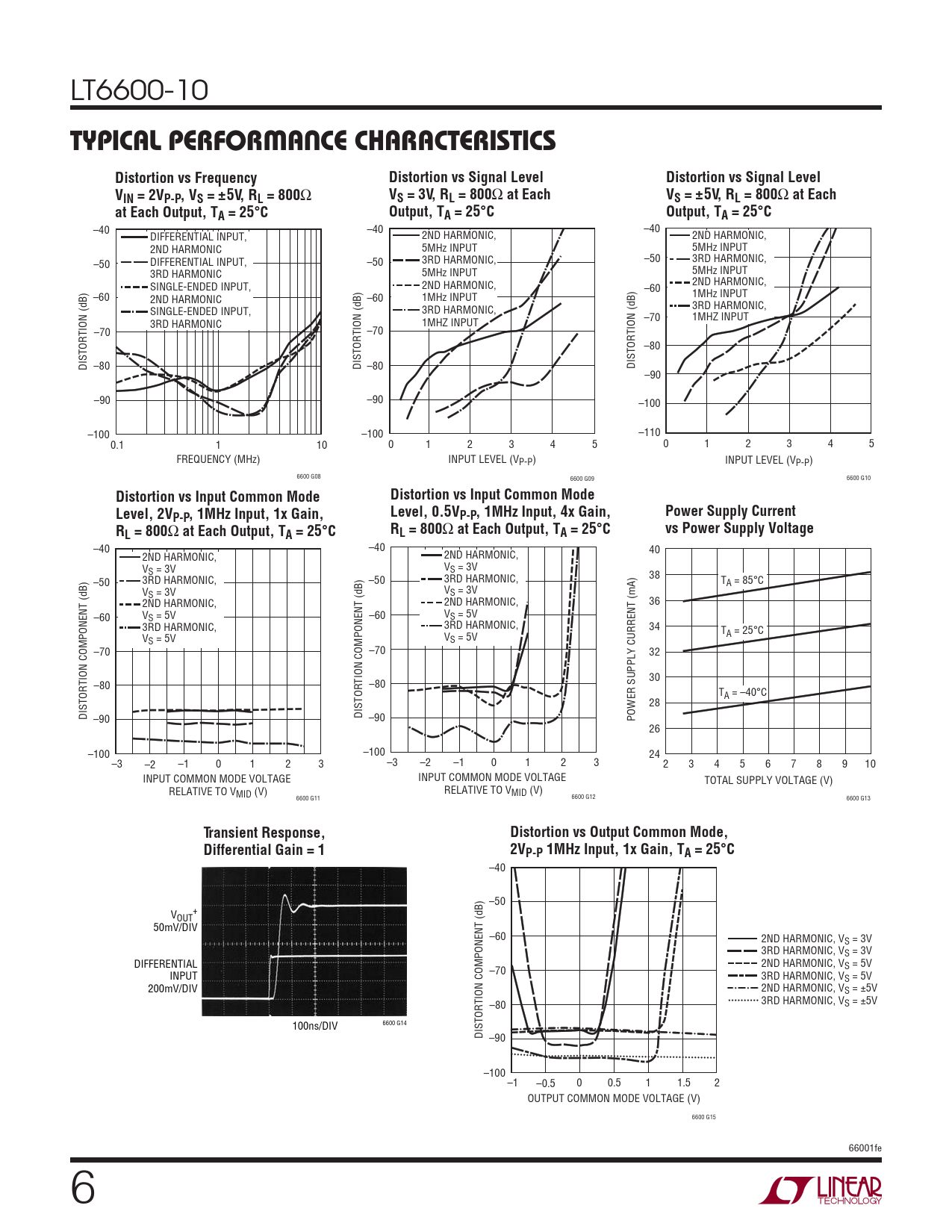 –40 –50 V + OUT 50mV/DIV –60 2ND HARMONIC, VS = 3V 3RD HARMONIC, VS = 3V DIFFERENTIAL 2ND HARMONIC, VS = 5V INPUT –70 3RD HARMONIC, VS = 5V 200mV/DIV 2ND HARMONIC, VS = ±5V –80 3RD HARMONIC, VS = ±5V 100ns/DIV 6600 G14 DISTORTION COMPONENT (dB) –90 –100 –1 –0.5 0 0.5 1 1.5 2 OUTPUT COMMON MODE VOLTAGE (V) 6600 G15 66001fe 6