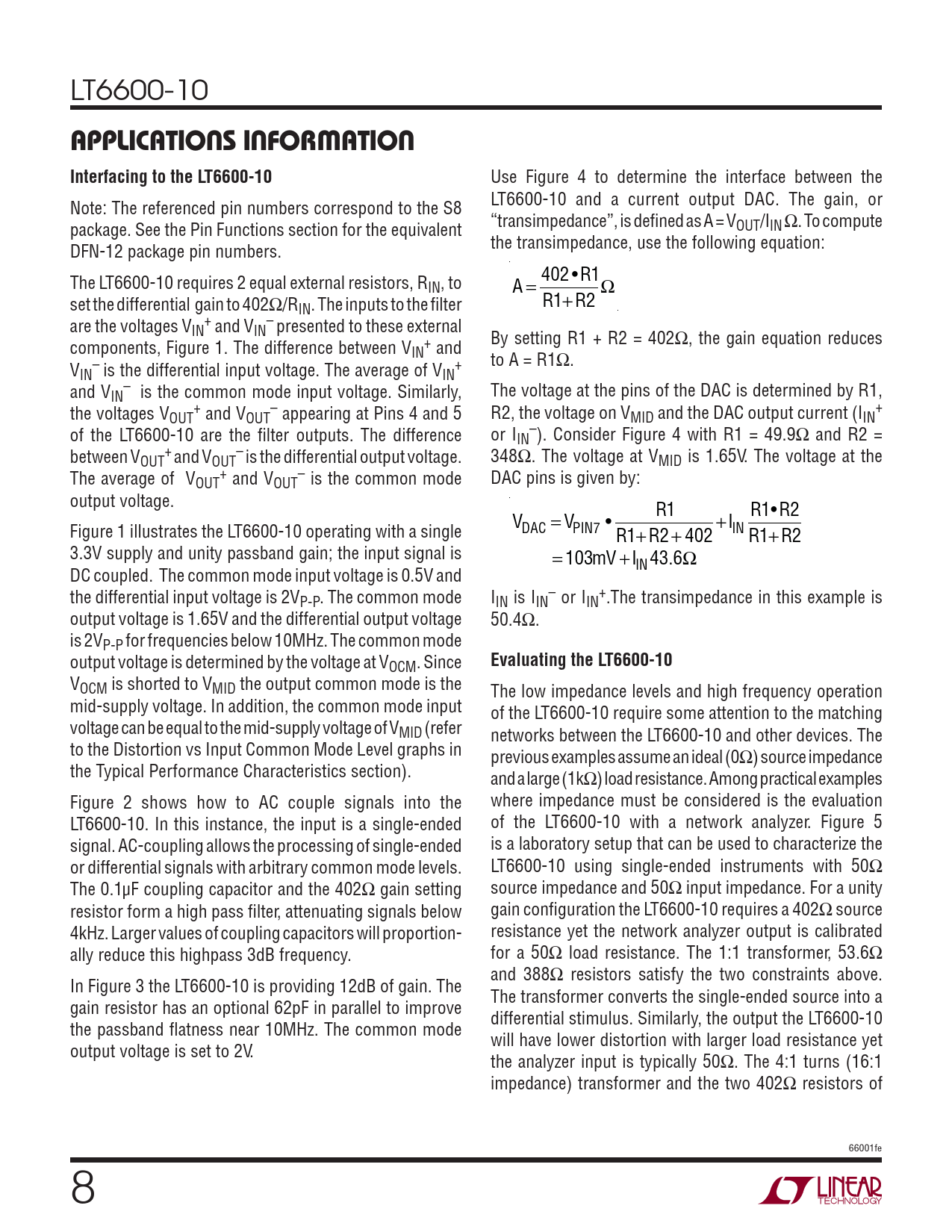 LT6600-10 APPLICATIONS INFORMATIONInterfacing to the LT6600-10 Use Figure 4 to determine the interface between the LT6600-10 and a current output DAC. The gain, or Note: The referenced pin numbers correspond to the S8 “transimpedance”, is defi ned as A = V package. See the Pin Functions section for the equivalent OUT/IIN Ω. To compute the transimpedance, use the following equation: DFN-12 package pin numbers. The LT6600-10 requires 2 equal external resistors, RIN, to A = 402 •R1Ω set the differential gain to 402Ω/R R1+ R2 IN. The inputs to the fi lter are the voltages V + – IN and VIN presented to these external By setting R1 + R2 = 402Ω, the gain equation reduces components, Figure 1. The difference between V + IN and to A = R1Ω. V – + IN is the differential input voltage. The average of VIN and V – IN is the common mode input voltage. Similarly, The voltage at the pins of the DAC is determined by R1, the voltages V + – + OUT and VOUT appearing at Pins 4 and 5 R2, the voltage on VMID and the DAC output current (IIN of the LT6600-10 are the fi lter outputs. The difference or I – IN ). Consider Figure 4 with R1 = 49.9Ω and R2 = between V + – OUT and VOUT is the differential output voltage. 348Ω. The voltage at VMID is 1.65V. The voltage at the The average of V + – OUT and VOUT is the common mode DAC pins is given by: output voltage. R1 R1• R2 V = V • +I Figure 1 illustrates the LT6600-10 operating with a single DAC PIN7 R1+ R2 + 402 IN R1+ R2 3.3V supply and unity passband gain; the input signal is = 103mV +I 43.6Ω IN DC coupled. The common mode input voltage is 0.5V and the differential input voltage is 2V – + P-P. The common mode IIN is IIN or IIN .The transimpedance in this example is output voltage is 1.65V and the differential output voltage 50.4Ω. is 2VP-P for frequencies below 10MHz. The common mode output voltage is determined by the voltage at VOCM. Since Evaluating the LT6600-10 VOCM is shorted to VMID the output common mode is the The low impedance levels and high frequency operation mid-supply voltage. In addition, the common mode input of the LT6600-10 require some attention to the matching voltage can be equal to the mid-supply voltage of VMID (refer networks between the LT6600-10 and other devices. The to the Distortion vs Input Common Mode Level graphs in previous examples assume an ideal (0Ω) source impedance the Typical Performance Characteristics section). and a large (1kΩ) load resistance. Among practical examples Figure 2 shows how to AC couple signals into the where impedance must be considered is the evaluation LT6600-10. In this instance, the input is a single-ended of the LT6600-10 with a network analyzer. Figure 5 signal. AC-coupling allows the processing of single-ended is a laboratory setup that can be used to characterize the or differential signals with arbitrary common mode levels. LT6600-10 using single-ended instruments with 50Ω The 0.1μF coupling capacitor and the 402Ω gain setting source impedance and 50Ω input impedance. For a unity resistor form a high pass fi lter, attenuating signals below gain confi guration the LT6600-10 requires a 402Ω source 4kHz. Larger values of coupling capacitors will proportion- resistance yet the network analyzer output is calibrated ally reduce this highpass 3dB frequency. for a 50Ω load resistance. The 1:1 transformer, 53.6Ω and 388Ω resistors satisfy the two constraints above. In Figure 3 the LT6600-10 is providing 12dB of gain. The The transformer converts the single-ended source into a gain resistor has an optional 62pF in parallel to improve differential stimulus. Similarly, the output the LT6600-10 the passband fl atness near 10MHz. The common mode will have lower distortion with larger load resistance yet output voltage is set to 2V. the analyzer input is typically 50Ω. The 4:1 turns (16:1 impedance) transformer and the two 402Ω resistors of 66001fe 8