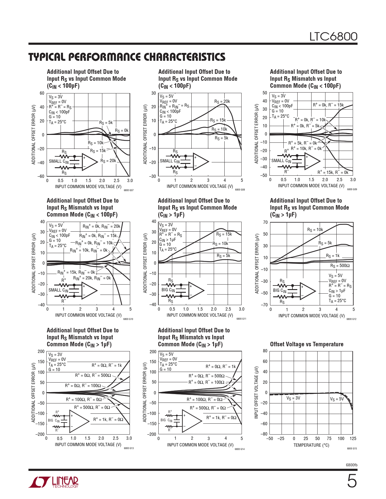 200 80 V 200 S = 3V VS = 5V V 150 VREF = 0V REF = 0V 60 T 150 A = 25°C R+ = 0Ω, R– = 1k TA = 25°C R+ = 0Ω, R– = 1k G = 10 100 G = 10 100 40 R+ = 0Ω, R– = 500Ω R+ = 0Ω, R– = 500Ω 50 50 R+ = 0Ω, R– = 100Ω 20 R+ = 0Ω, R– = 100Ω 0 0 0 R+ = 100Ω, R– = 0Ω R+ = 100Ω, R– = 0Ω VS = 3V VS = 5V –50 –50 –20 R+ = 500Ω, R– = 0Ω R+ = 500Ω, R– = 0Ω –100 R+ R+ + –100 + –40 R+ = 1k, R– = 0Ω INPUT OFFSET VOLTAGE (µV) ADDITIONAL OFFSET ERROR (µV) BIG C R+ = 1k, R– = 0Ω ADDITIONAL OFFSET ERROR (µV) BIG C –150 IN –150 IN –60 – – R– R– –200 –200 –80 0 0.5 1.0 1.5 2.0 2.5 3.0 0 1 2 3 4 5 –50 –25 0 25 50 75 100 125 INPUT COMMON MODE VOLTAGE (V) INPUT COMMON MODE VOLTAGE (V) TEMPERATURE (°C) 6800 G13 6800 G14 6800 G15 6800fb Document Outline Features Applications Description Typical Application Absolute Maximum Ratings Pin Configuration Order Information Electrical Characteristics Typical Performance Characteristics Pin Functions Block Diagram Applications Information Typical Applications Package Description Revision History Related Parts Typical Application