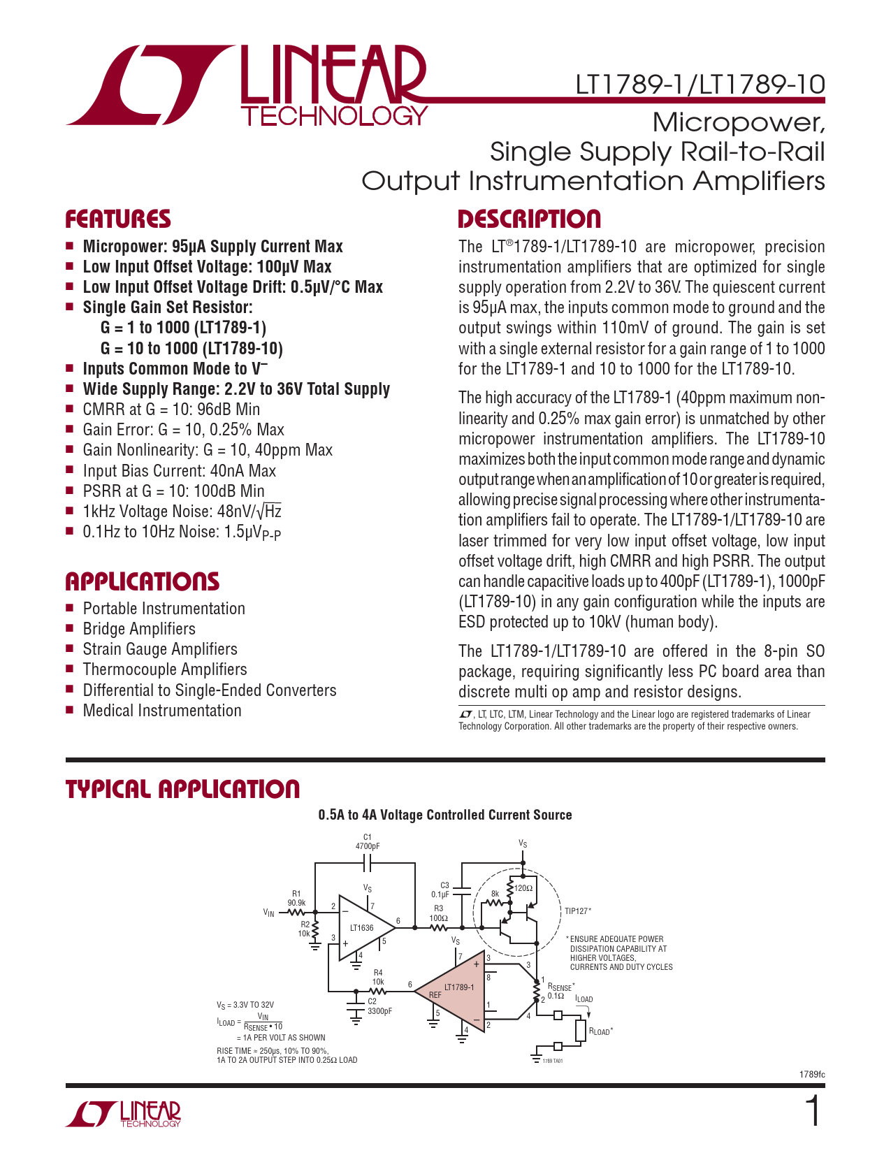 can handle capacitive loads up to 400pF (LT1789-1), 1000pF (LT1789-10) in any gain configuration while the inputs are n Portable Instrumentation ESD protected up to 10kV (human body). n Bridge Amplifiers n Strain Gauge Amplifiers The LT1789-1/LT1789-10 are offered in the 8-pin SO n Thermocouple Amplifiers package, requiring significantly less PC board area than n Differential to Single-Ended Converters discrete multi op amp and resistor designs. n Medical Instrumentation L, LT, LTC, LTM, Linear Technology and the Linear logo are registered trademarks of Linear Technology Corporation. All other trademarks are the property of their respective owners.