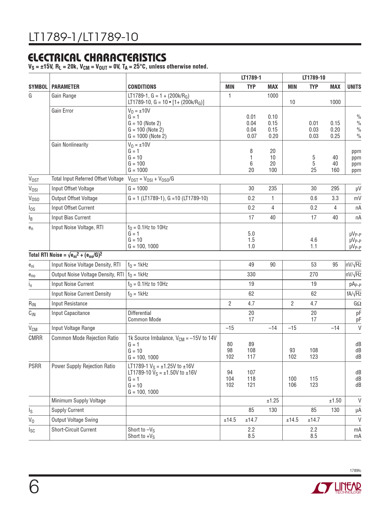 eni Input Noise Voltage Density, RTI fO = 1kHz 49 90 53 95 nV/√Hz eno Output Noise Voltage Density, RTI fO = 1kHz 330 270 nV/√Hz in Input Noise Current fO = 0.1Hz to 10Hz 19 19 pAP-P Input Noise Current Density fO = 1kHz 62 62 fA/√Hz RIN Input Resistance 2 4.7 2 4.7 GΩ CIN Input Capacitance Differential 20 20 pF Common Mode 17 17 pF VCM Input Voltage Range –15 –14 –15 –14 V CMRR Common Mode Rejection Ratio 1k Source Imbalance, VCM = –15V to 14V G = 1 80 89 dB G = 10 98 108 93 108 dB G = 100, 1000 102 117 102 123 dB PSRR Power Supply Rejection Ratio LT1789-1 VS = ±1.25V to ±16V LT1789-10 VS = ±1.50V to ±16V 94 107 dB G = 1 104 118 100 115 dB G = 10 102 121 106 123 dB G = 100, 1000 Minimum Supply Voltage ±1.25 ±1.50 V IS Supply Current 85 130 85 130 μA VO Output Voltage Swing ±14.5 ±14.7 ±14.5 ±14.7 V ISC Short-Circuit Current Short to –VS 2.2 2.2 mA Short to +VS 8.5 8.5 mA 1789fc 6