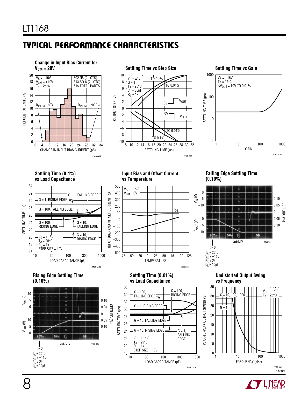 36 35 G = 100, V 10 G = 100, S = ±15V 34 FALLING EDGE RISING EDGE 30 G = 10, 100, 1000 TA = 25°C (V) 5 0.10 INV SETTLING (%) 32 0 0.05 G = 1, RISING EDGE 25 µs) G = 1 30 0 28 20 10 0.05 G = 10, FALLING EDGE (V) 26 15 5 0.10 OUTV 24 G = 10, RISING EDGE G = 1, 0 SETTLING TIME ( FALLING 10 22 VS = ±15V EDGE 5µs/DIV T 1168 G25 A = 25°C PEAK-TO-PEAK OUTPUT SWING (V) 5 20 R t = 0 L = 1k STEP SIZE = 10V T 0 A = 25°C 18 V 10 30 100 300 1000 1 10 100 1000 S = ±15V RL = 2k LOAD CAPACITANCE (pF) FREQUENCY (kHz) CL = 15pF 1168 G26 1168 G27 1168fa 8