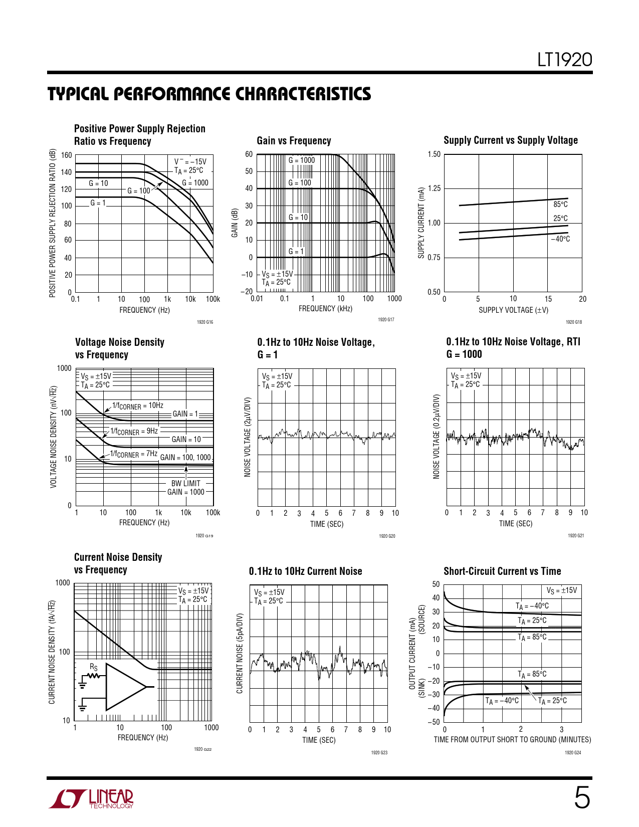 1000 V V V S = ±15V S = ±15V S = ±15V T T T A = 25°C A = 25°C A = 25°C √Hz) 1/fCORNER = 10Hz 100 GAIN = 1 µV/DIV) µV/DIV) 1/fCORNER = 9Hz GAIN = 10 1/fCORNER = 7Hz 10 GAIN = 100, 1000 NOISE VOLTAGE (2 NOISE VOLTAGE (0.2 VOLTAGE NOISE DENSITY (nV BW LIMIT GAIN = 1000 0 1 10 100 1k 10k 100k 0 1 2 3 4 5 6 7 8 9 10 0 1 2 3 4 5 6 7 8 9 10 FREQUENCY (Hz) TIME (SEC) TIME (SEC) 1920 G19 1920 G20 1920 G21
