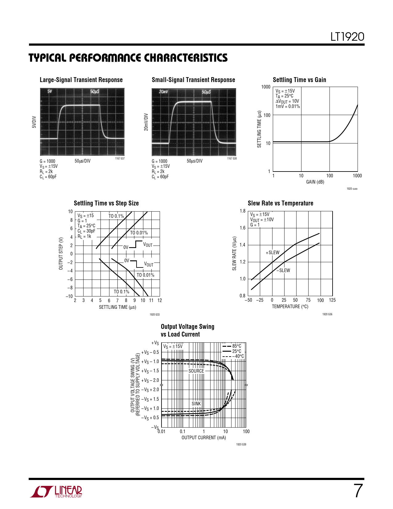 10 1.8 V VS = ±15 TO 0.1% S = ± 15V 8 V G = 1 OUT = ±10V G = 1 T 6 A = 25°C 1.6 CL = 30pF TO 0.01% 4 RL = 1k µs) 2 VOUT 1.4 0V + SLEW 0 – 2 0V 1.2 VOUT OUTPUT STEP (V) SLEW RATE (V/ – 4 – SLEW TO 0.01% – 6 1.0 – 8 TO 0.1% –10 0.8 2 3 4 5 6 7 8 9 10 11 12 – 50 –25 0 25 50 75 100 125 SETTLING TIME ( TEMPERATURE ( µs) °C) 1920 G33 1920 G36