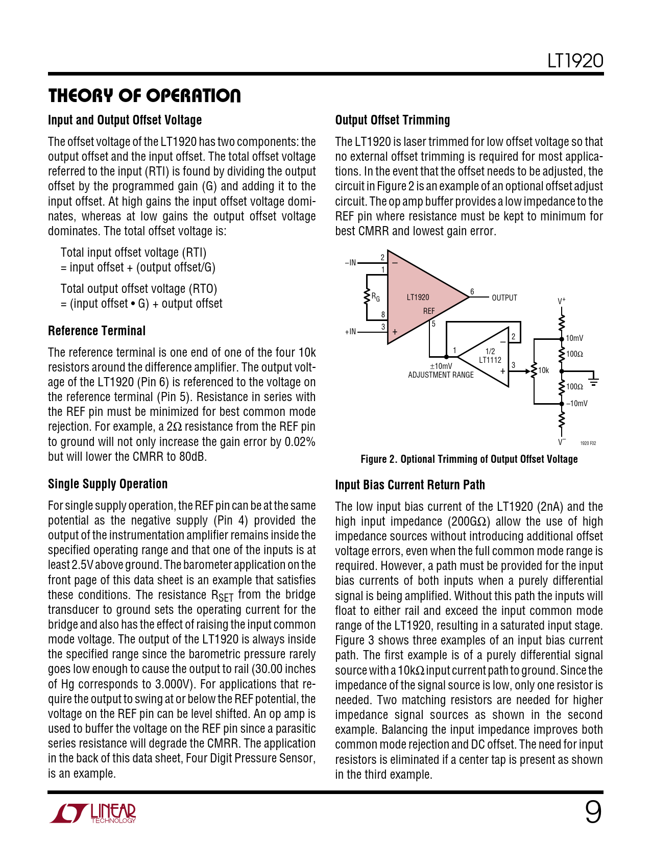 For single supply operation, the REF pin can be at the same The low input bias current of the LT1920 (2nA) and the potential as the negative supply (Pin 4) provided the high input impedance (200GΩ) allow the use of high output of the instrumentation amplifier remains inside the impedance sources without introducing additional offset specified operating range and that one of the inputs is at voltage errors, even when the full common mode range is least 2.5V above ground. The barometer application on the required. However, a path must be provided for the input front page of this data sheet is an example that satisfies bias currents of both inputs when a purely differential these conditions. The resistance RSET from the bridge signal is being amplified. Without this path the inputs will transducer to ground sets the operating current for the float to either rail and exceed the input common mode bridge and also has the effect of raising the input common range of the LT1920, resulting in a saturated input stage. mode voltage. The output of the LT1920 is always inside Figure 3 shows three examples of an input bias current the specified range since the barometric pressure rarely path. The first example is of a purely differential signal goes low enough to cause the output to rail (30.00 inches source with a 10kΩ input current path to ground. Since the of Hg corresponds to 3.000V). For applications that re- impedance of the signal source is low, only one resistor is quire the output to swing at or below the REF potential, the needed. Two matching resistors are needed for higher voltage on the REF pin can be level shifted. An op amp is impedance signal sources as shown in the second used to buffer the voltage on the REF pin since a parasitic example. Balancing the input impedance improves both series resistance will degrade the CMRR. The application common mode rejection and DC offset. The need for input in the back of this data sheet, Four Digit Pressure Sensor, resistors is eliminated if a center tap is present as shown is an example. in the third example. 9
