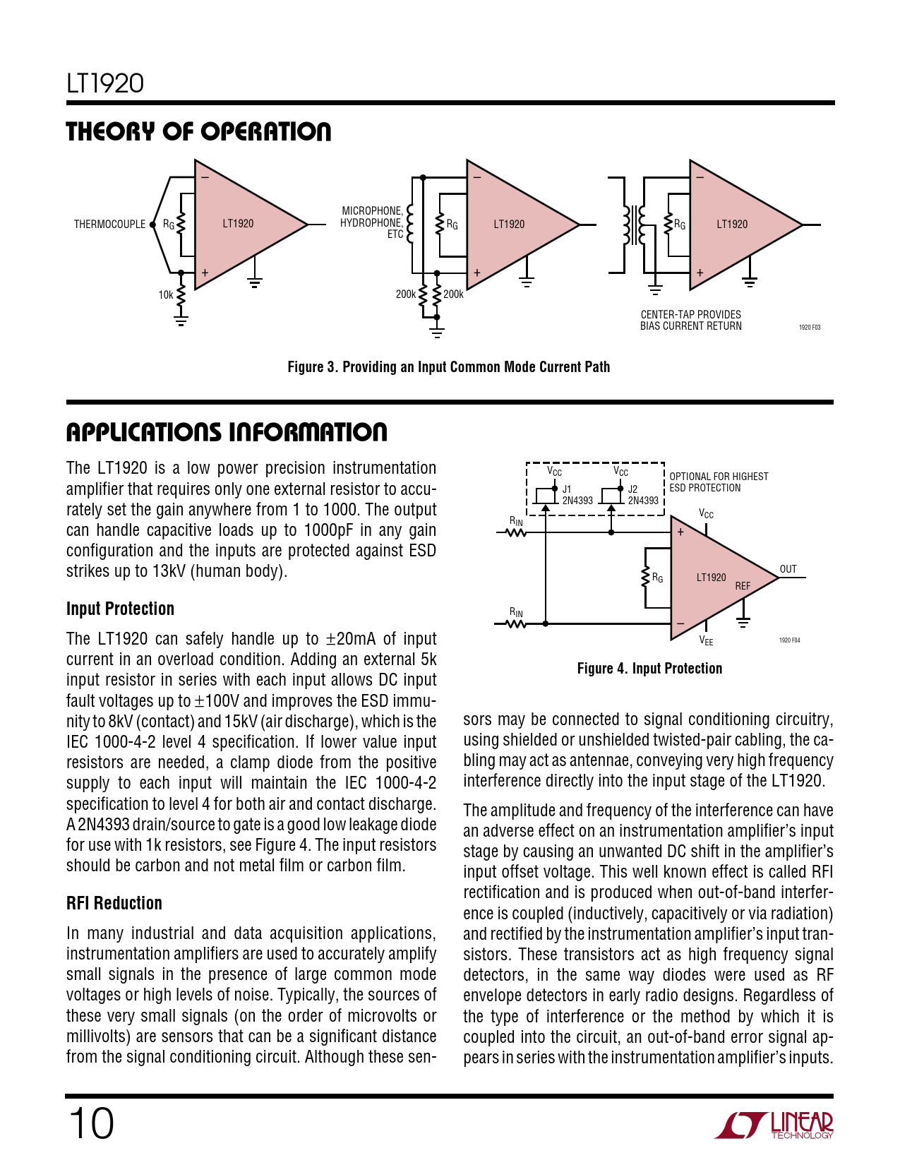 – – – MICROPHONE, THERMOCOUPLE RG LT1920 HYDROPHONE, RG LT1920 RG LT1920 ETC + + + 10k 200k 200k CENTER-TAP PROVIDES BIAS CURRENT RETURN 1920 F03
