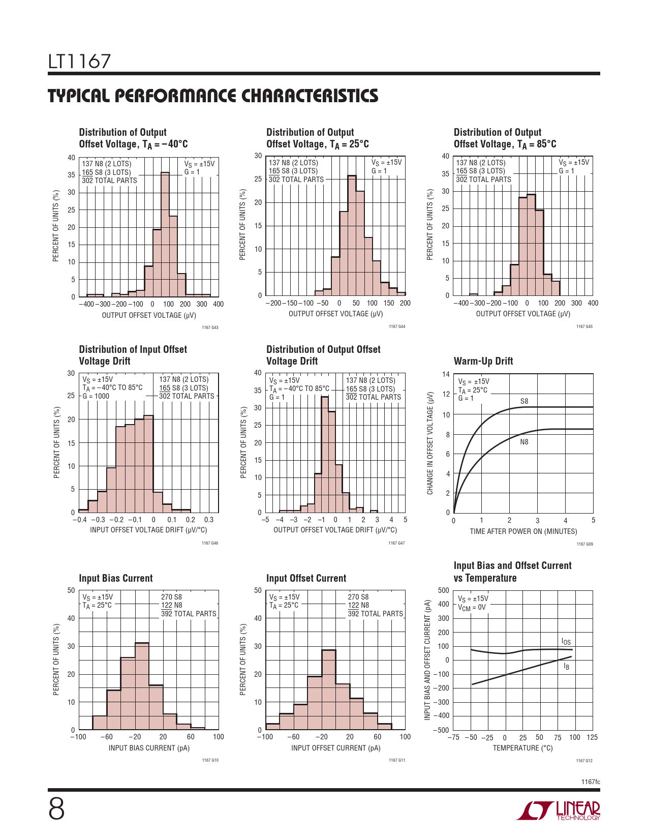 40 30 40 137 N8 (2 LOTS) V 137 N8 (2 LOTS) V 137 N8 (2 LOTS) V S = ±15V S = ±15V S = ±15V 165 S8 (3 LOTS) G = 1 165 S8 (3 LOTS) G = 1 35 165 S8 (3 LOTS) G = 1 35 302 TOTAL PARTS 25 302 TOTAL PARTS 302 TOTAL PARTS 30 30 20 25 25 20 15 20 15 15 10 PERCENT OF UNITS (%) PERCENT OF UNITS (%) PERCENT OF UNITS (%) 10 10 5 5 5 0 0 0 –400 –300 –200 –100 0 100 200 300 400 – 200 –150 –100 –50 0 50 100 150 200 –400 –300 –200 –100 0 100 200 300 400 OUTPUT OFFSET VOLTAGE (μV) OUTPUT OFFSET VOLTAGE (μV) OUTPUT OFFSET VOLTAGE (μV) 1167 G43 1167 G44 1167 G45