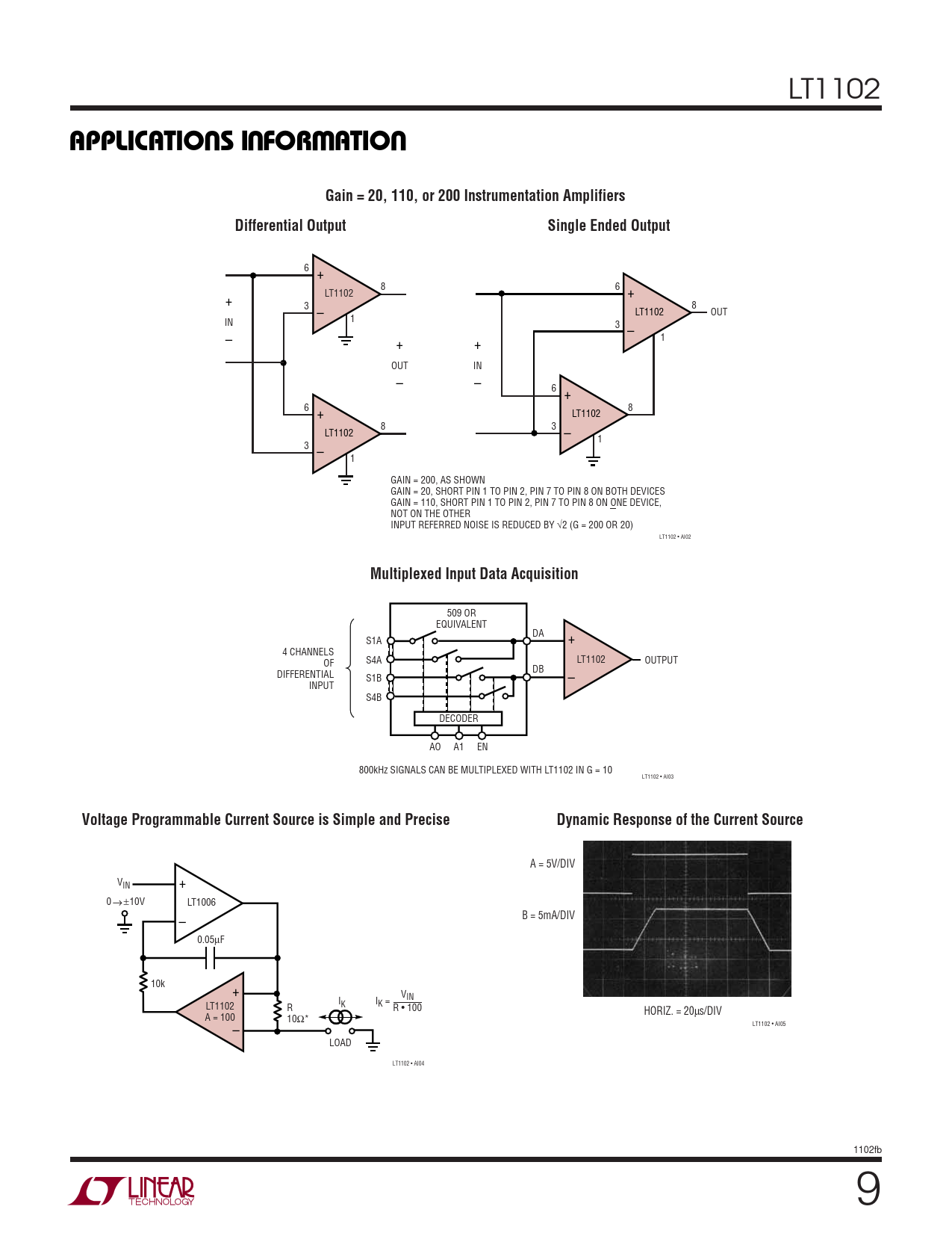 LT1102 UUWUAPPLICATIO S I FOR ATIOGain = 20, 110, or 200 Instrumentation AmplifiersDifferential OutputSingle Ended Output 6 + 8 6 LT1102 + + 3 8 LT1102 OUT – 1 IN 3 – 1 – + + OUT IN – – 6 + 6 8 + LT1102 8 3 LT1102 – 1 3 – 1 GAIN = 200, AS SHOWN GAIN = 20, SHORT PIN 1 TO PIN 2, PIN 7 TO PIN 8 ON BOTH DEVICES GAIN = 110, SHORT PIN 1 TO PIN 2, PIN 7 TO PIN 8 ON ONE DEVICE, NOT ON THE OTHER INPUT REFERRED NOISE IS REDUCED BY √2 (G = 200 OR 20) LT1102 • AI02 Multiplexed Input Data Acquisition 509 OR EQUIVALENT DA S1A + 4 CHANNELS S4A LT1102 OUTPUT OF DB DIFFERENTIAL S1B – INPUT S4B DECODER AO A1 EN 800kHz SIGNALS CAN BE MULTIPLEXED WITH LT1102 IN G = 10 LT1102 • AI03 Voltage Programmable Current Source is Simple and PreciseDynamic Response of the Current Source A = 5V/DIV VIN + 0 ±10V LT1006 B = 5mA/DIV – 0.05μF 10k + V I I IN LT1102 K K = R R • 100 HORIZ. = 20μs/DIV A = 100 10Ω* FPO LT1102 • AI05 – LOAD LT1102 • AI04 1102fb 9