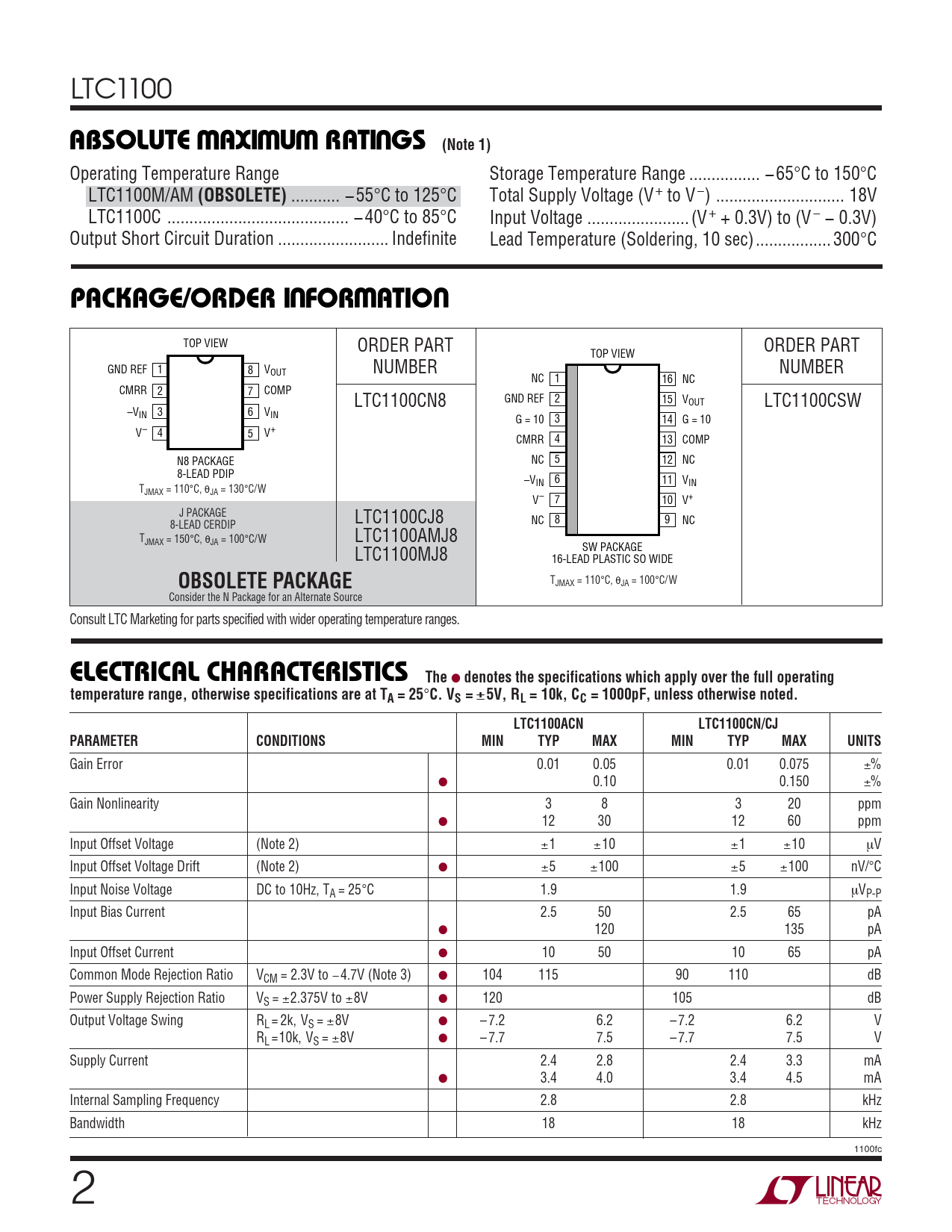 Operating Temperature Range Storage Temperature Range .. −65°C to 150°C LTC1100M/AM