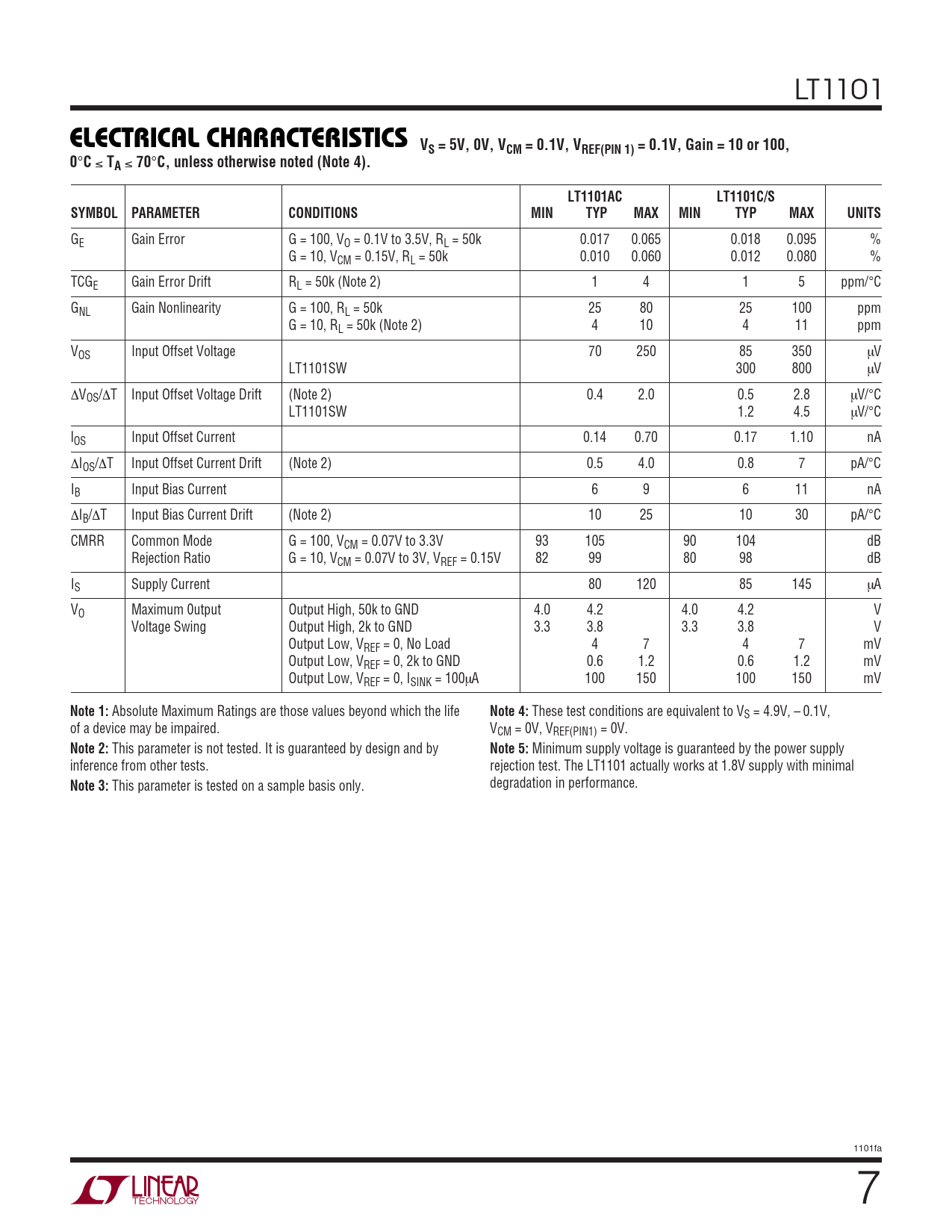 LT1101 ELECTRICAL CHARACTERISTICS VS = 5V, 0V, VCM = 0.1V, VREF(PIN 1) = 0.1V, Gain = 10 or 100,0 ° C ≤ TA ≤ 70 ° C, unless otherwise noted (Note 4).LT1101ACLT1101C/SSYMBOLPARAMETERCONDITIONSMINTYPMAXMINTYPMAXUNITS GE Gain Error G = 100, VO = 0.1V to 3.5V, RL = 50k 0.017 0.065 0.018 0.095 % G = 10, VCM = 0.15V, RL = 50k 0.010 0.060 0.012 0.080 % TCGE Gain Error Drift RL = 50k (Note 2) 1 4 1 5 ppm/°C GNL Gain Nonlinearity G = 100, RL = 50k 25 80 25 100 ppm G = 10, RL = 50k (Note 2) 4 10 4 11 ppm VOS Input Offset Voltage 70 250 85 350 µV LT1101SW 300 800 µV ∆VOS/∆T Input Offset Voltage Drift (Note 2) 0.4 2.0 0.5 2.8 µV/°C LT1101SW 1.2 4.5 µV/°C lOS Input Offset Current 0.14 0.70 0.17 1.10 nA ∆IOS/∆T Input Offset Current Drift (Note 2) 0.5 4.0 0.8 7 pA/°C IB Input Bias Current 6 9 6 11 nA ∆IB/∆T Input Bias Current Drift (Note 2) 10 25 10 30 pA/°C CMRR Common Mode G = 100, VCM = 0.07V to 3.3V 93 105 90 104 dB Rejection Ratio G = 10, VCM = 0.07V to 3V, VREF = 0.15V 82 99 80 98 dB IS Supply Current 80 120 85 145 µA VO Maximum 0utput Output High, 50k to GND 4.0 4.2 4.0 4.2 V Voltage Swing Output High, 2k to GND 3.3 3.8 3.3 3.8 V Output Low, VREF = 0, No Load 4 7 4 7 mV Output Low, VREF = 0, 2k to GND 0.6 1.2 0.6 1.2 mV Output Low, VREF = 0, ISINK = 100µA 100 150 100 150 mV Note 1: Absolute Maximum Ratings are those values beyond which the life Note 4: These test conditions are equivalent to VS = 4.9V, – 0.1V, of a device may be impaired. VCM = 0V, VREF(PIN1) = 0V. Note 2: This parameter is not tested. It is guaranteed by design and by Note 5: Minimum supply voltage is guaranteed by the power supply inference from other tests. rejection test. The LT1101 actually works at 1.8V supply with minimal Note 3: This parameter is tested on a sample basis only. degradation in performance. 1101fa 7
