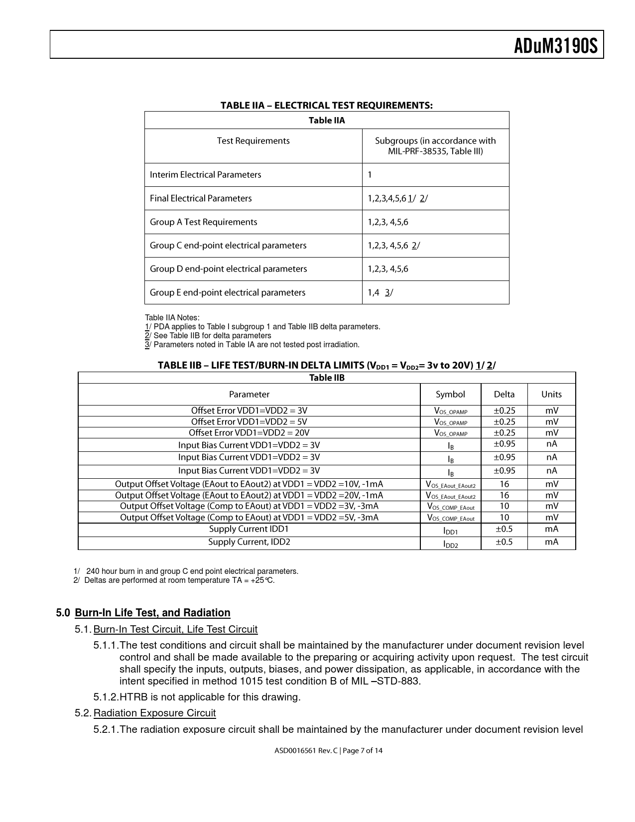 Table IIA Notes: 1/ PDA applies to Table I subgroup 1 and Table IIB delta parameters. 2/ See Table IIB for delta parameters 3/ Parameters noted in Table IA are not tested post irradiation. 1/ 240 hour burn in and group C end point electrical parameters. 2/ Deltas are performed at room temperature TA = +25°C.