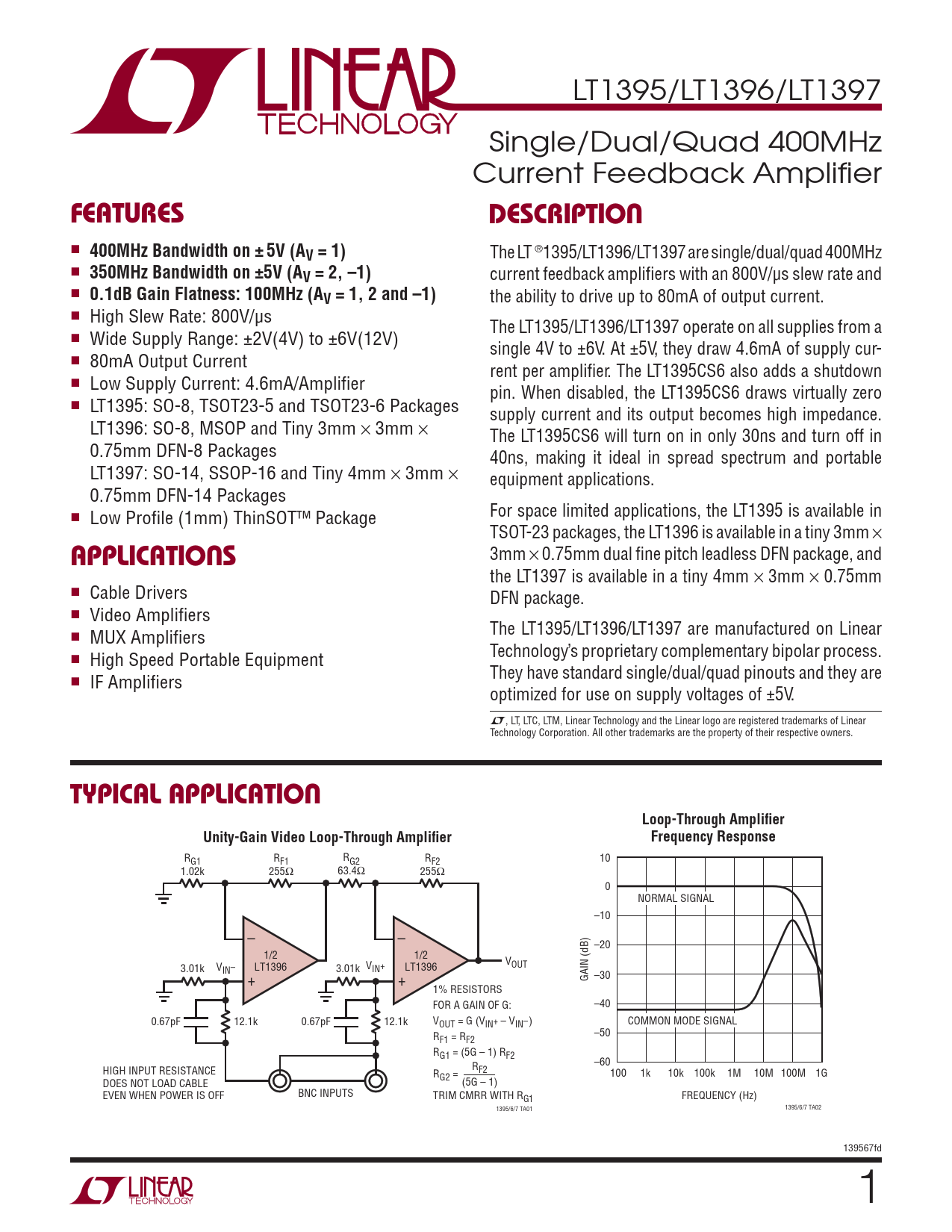 LT1395/LT1396/LT1397 Single/Dual/Quad 400MHz Current Feedback Amplifi er FEATURESDESCRIPTION n 400MHz Bandwidth on ± 5V (AV = 1) The LT ®1395/LT1396/LT1397 are single/dual/quad 400MHz n 350MHz Bandwidth on ±5V (AV = 2, –1) current feedback amplifi ers with an 800V/μs slew rate and n 0.1dB Gain Flatness: 100MHz (AV = 1, 2 and –1) the ability to drive up to 80mA of output current. n High Slew Rate: 800V/μs The LT1395/LT1396/LT1397 operate on all supplies from a n Wide Supply Range: ±2V(4V) to ±6V(12V) single 4V to ±6V. At ±5V, they draw 4.6mA of supply cur- n 80mA Output Current rent per amplifi er. The LT1395CS6 also adds a shutdown n Low Supply Current: 4.6mA/Amplifi er pin. When disabled, the LT1395CS6 draws virtually zero n LT1395: SO-8, TSOT23-5 and TSOT23-6 Packages supply current and its output becomes high impedance. LT1396: SO-8, MSOP and Tiny 3mm × 3mm × The LT1395CS6 will turn on in only 30ns and turn off in 0.75mm DFN-8 Packages 40ns, making it ideal in spread spectrum and portable LT1397: SO-14, SSOP-16 and Tiny 4mm × 3mm × equipment applications. 0.75mm DFN-14 Packages For space limited applications, the LT1395 is available in n Low Profi le (1mm) ThinSOT™ Package TSOT-23 packages, the LT1396 is available in a tiny 3mm × 3mm APPLICATIONS × 0.75mm dual fi ne pitch leadless DFN package, and the LT1397 is available in a tiny 4mm × 3mm × 0.75mm n Cable Drivers DFN package. n Video Amplifi ers The LT1395/LT1396/LT1397 are manufactured on Linear n MUX Amplifi ers Technology’s proprietary complementary bipolar process. n High Speed Portable Equipment They have standard single/dual/quad pinouts and they are n IF Amplifi ers optimized for use on supply voltages of ±5V. L, LT, LTC, LTM, Linear Technology and the Linear logo are registered trademarks of Linear Technology Corporation. All other trademarks are the property of their respective owners. TYPICAL APPLICATIONLoop-Through Amplifi erUnity-Gain Video Loop-Through Amplifi erFrequency Response R R R R G1 F1 G2 F2 10 1.02k 255Ω 63.4Ω 255Ω 0 NORMAL SIGNAL –10 – – –20 1/2 1/2 V V OUT 3.01k V LT1396 IN– 3.01k IN+ LT1396 + + GAIN (dB) –30 1% RESISTORS FOR A GAIN OF G: –40 0.67pF 12.1k 0.67pF 12.1k VOUT = G (VIN+ – VIN–) COMMON MODE SIGNAL R –50 F1 = RF2 RG1 = (5G – 1) RF2 –60 HIGH INPUT RESISTANCE R R F2 G2 = 100 1k 10k 100k 1M 10M 100M 1G DOES NOT LOAD CABLE (5G – 1) EVEN WHEN POWER IS OFF BNC INPUTS TRIM CMRR WITH RG1 FREQUENCY (Hz) 1395/6/7 TA01 1395/6/7 TA02 139567fd 1