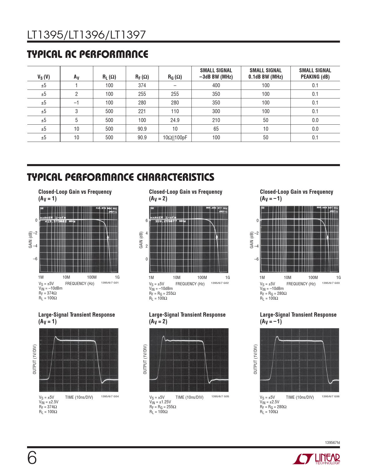 OUTPUT (1V/DIV) OUTPUT (1V/DIV) OUTPUT (1V/DIV) V 1395/6/7 G05 1395/6/7 G06 S = ±5V TIME (10ns/DIV) 1395/6/7 G04 VS = ±5V TIME (10ns/DIV) VS = ±5V TIME (10ns/DIV) VIN = ±2.5V VIN = ±1.25V VIN = ±2.5V RF = 374Ω RF = RG = 255Ω RF = RG = 280Ω RL = 100Ω RL = 100Ω RL = 100Ω 139567fd 6