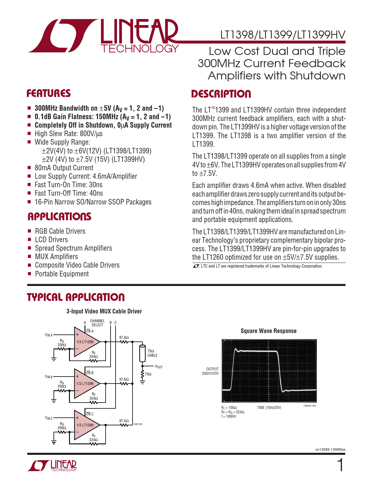 LT1398/LT1399/LT1399HV Low Cost Dual and Triple 300MHz Current Feedback Amplifiers with Shutdown