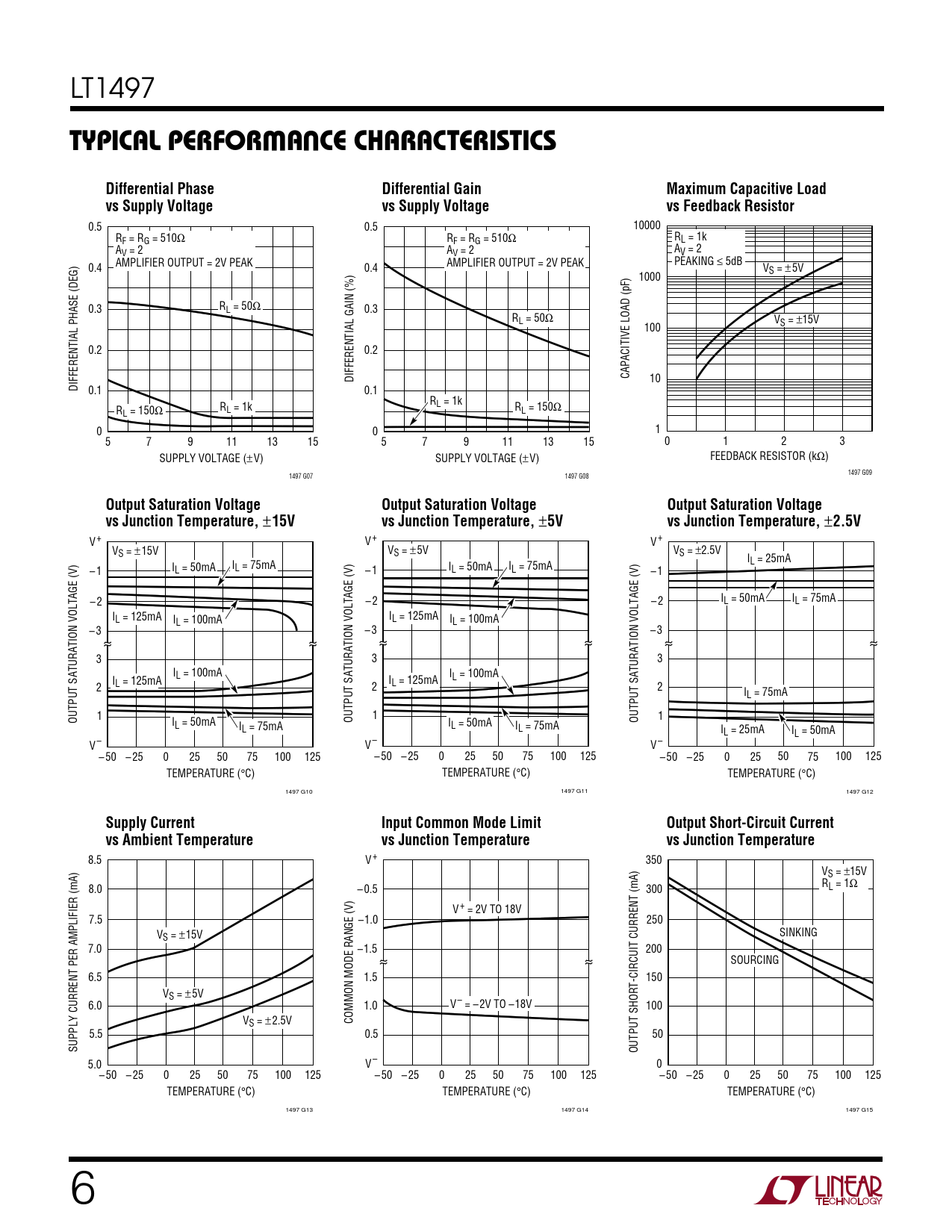8.5 V + 350 VS = ±15V R 8.0 – 0.5 300 L = 1Ω V + = 2V TO 18V 7.5 –1.0 250 V SINKING S = ±15V 7.0 –1.5 200 SOURCING 6.5 1.5 150 VS = ±5V 6.0 1.0 V – = – 2V TO –18V 100 VS = ±2.5V COMMON MODE RANGE (V) 5.5 0.5 50 SUPPLY CURRENT PER AMPLIFIER (mA) OUTPUT SHORT-CIRCUIT CURRENT (mA) 5.0 V – 0 – 50 – 25 0 25 50 75 100 125 – 50 – 25 0 25 50 75 100 125 – 50 – 25 0 25 50 75 100 125 TEMPERATURE (°C) TEMPERATURE (°C) TEMPERATURE (°C) 1497 G13 1497 G14 1497 G15 6