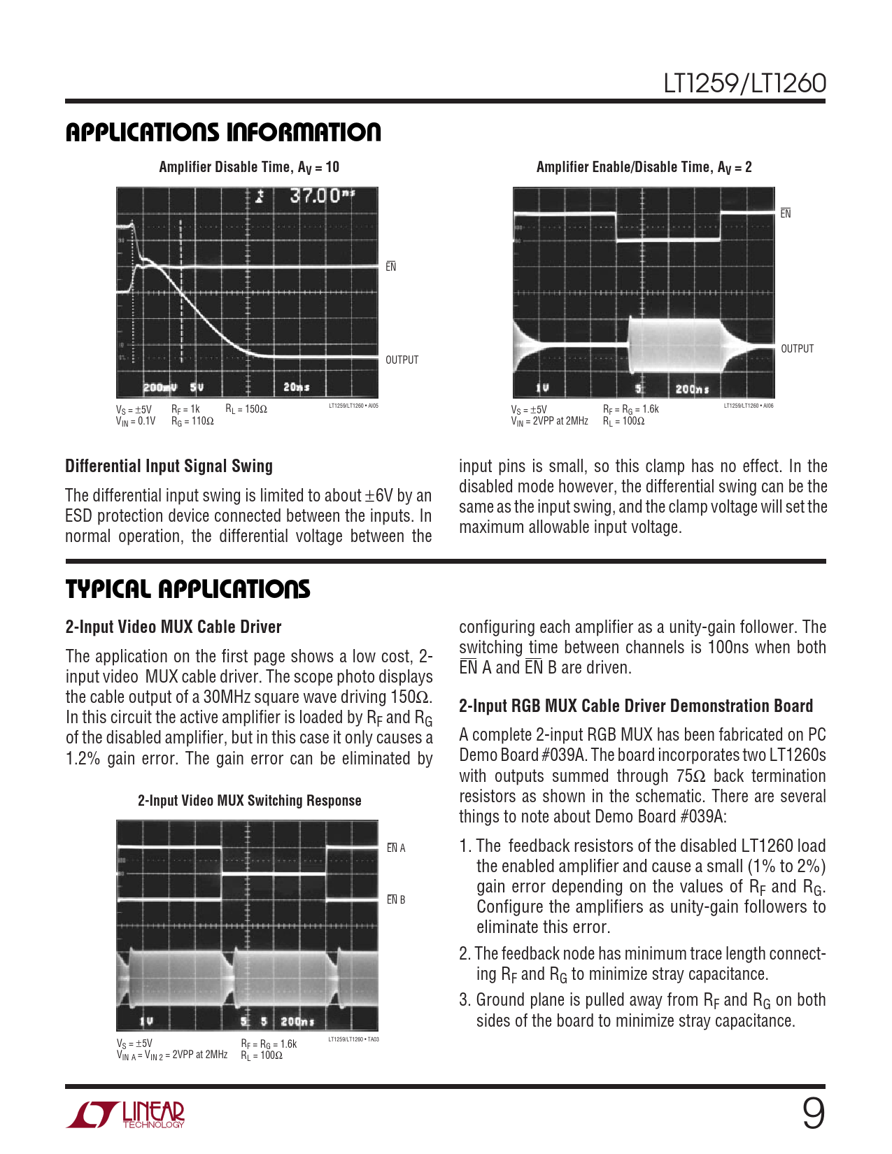 EN EN OUTPUT OUTPUT V LT1259/LT1260 • AI05 LT1259/LT1260 • AI06 S = ±5V RF = 1k RL = 150Ω VS = ±5V RF = RG = 1.6k VIN = 0.1V RG = 110Ω VIN = 2VPP at 2MHz RL = 100Ω