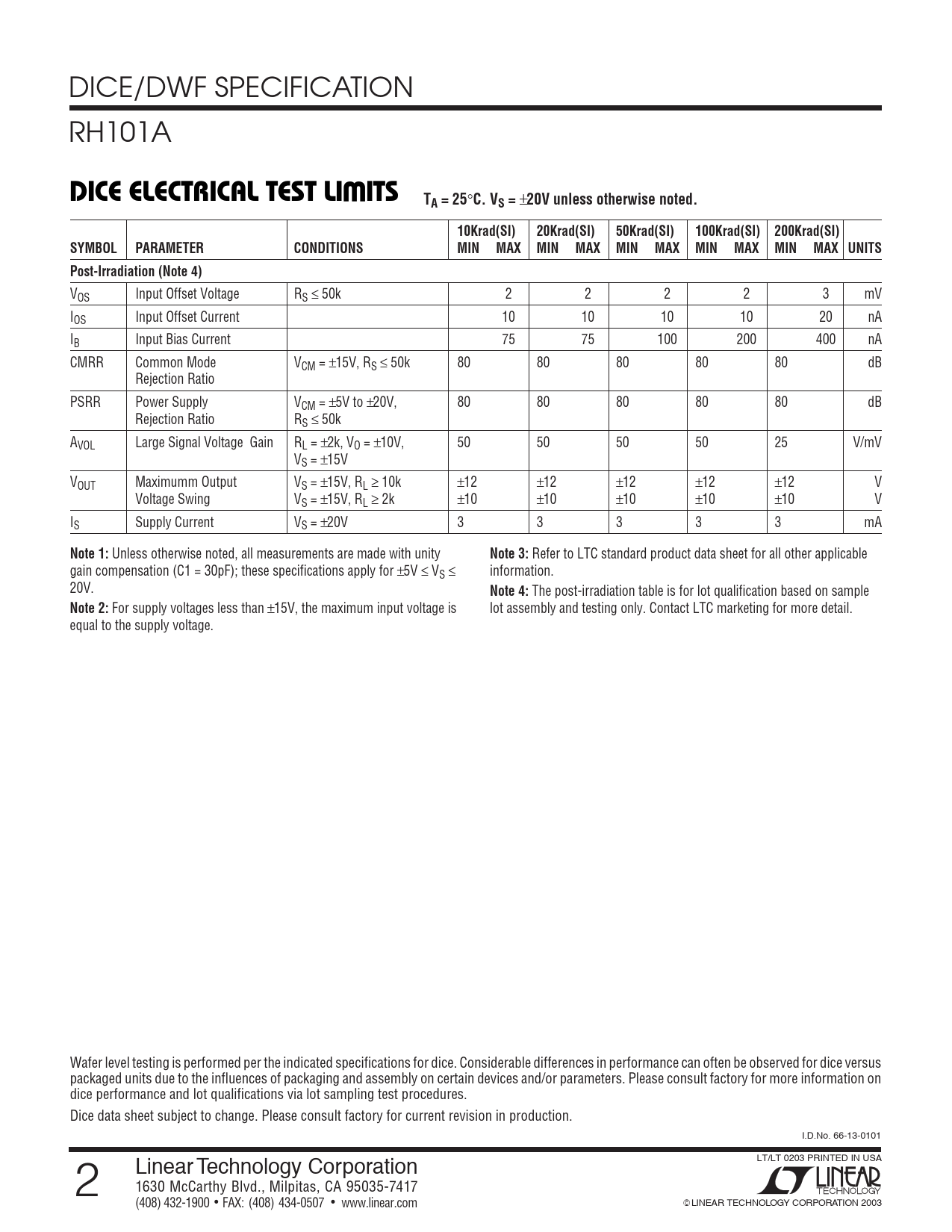 For supply voltages less than ±15V, the maximum input voltage is lot assembly and testing only. Contact LTC marketing for more detail. equal to the supply voltage. Wafer level testing is performed per the indicated specifications for dice. Considerable differences in performance can often be observed for dice versus packaged units due to the influences of packaging and assembly on certain devices and/or parameters. Please consult factory for more information on dice performance and lot qualifications via lot sampling test procedures. Dice data sheet subject to change. Please consult factory for current revision in production. I.D.No. 66-13-0101 LT/LT 0203 PRINTED IN USA 2 Linear Technology Corporation 1630 McCarthy Blvd., Milpitas, CA 95035-7417 (408) 432-1900 ● FAX: (408) 434-0507 ● www.linear.com © LINEAR TECHNOLOGY CORPORATION 2003