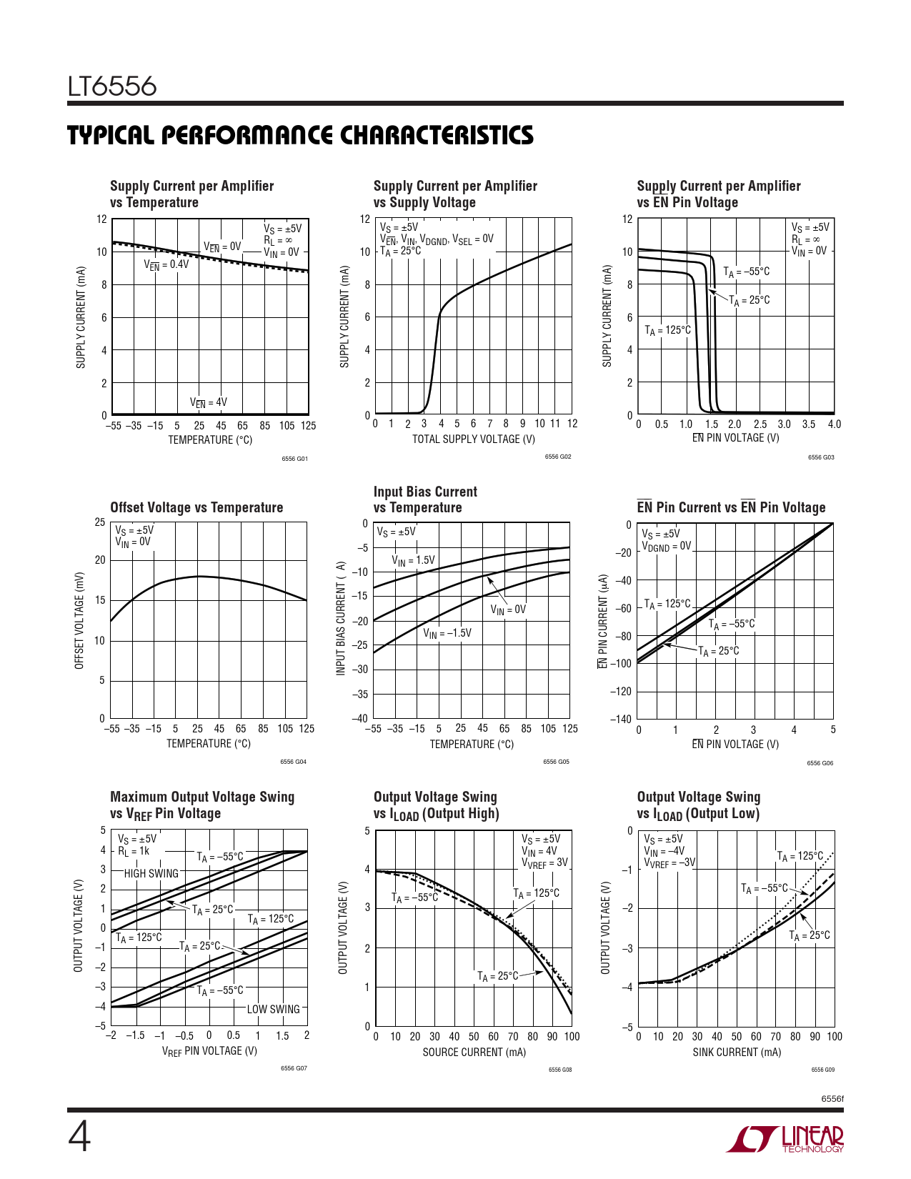 LT6556 WUTYPICAL PERFOR A CE CHARACTERISTICSSupply Current per Amplifi erSupply Current per Amplifi erSupply Current per Amplifi ervs Temperaturevs Supply Voltagevs ⎯ E ⎯ N Pin Voltage 12 12 12 V V V S = ±5V S = ±5V S = ±5V R V R L = ∞ EN, VIN, VDGND, VSEL = 0V L = ∞ V 10 EN = 0V V 10 T IN = 0V A = 25°C 10 VIN = 0V VEN = 0.4V TA = –55°C 8 8 8 TA = 25°C 6 6 6 TA = 125°C 4 4 4 SUPPLY CURRENT (mA) SUPPLY CURRENT (mA) SUPPLY CURRENT (mA) 2 2 2 VEN = 4V 0 0 0 –55 –35 –15 5 0 1 25 45 65 85 105 125 2 3 4 5 6 7 8 9 10 11 12 0 0.5 1.0 1.5 2.0 2.5 3.0 3.5 4.0 TEMPERATURE (°C) TOTAL SUPPLY VOLTAGE (V) EN PIN VOLTAGE (V) 6556 G02 6556 G03 6556 G01 Input Bias CurrentOffset Voltage vs Temperaturevs Temperature ⎯ E ⎯ N Pin Current vs ⎯ E ⎯ N Pin Voltage 25 0 0 VS = ±5V VS = ±5V VS = ±5V VIN = 0V –5 V –20 DGND = 0V 20 V A) IN = 1.5V –10 A) –40 μ –15 15 T V A = 125°C IN = 0V –60 –20 TA = –55°C VIN = –1.5V 10 –80 –25 TA = 25°C OFFSET VOLTAGE (mV) EN PIN CURRENT ( –100 INPUT BIAS CURRENT ( –30 5 –35 –120 0 –40 –140 –55 –35 –15 5 25 45 65 85 105 125 –55 –35 –15 5 25 45 65 85 105 125 0 1 2 3 4 5 TEMPERATURE (°C) TEMPERATURE (°C) EN PIN VOLTAGE (V) 6556 G04 6556 G05 6556 G06 Maximum Output Voltage SwingOutput Voltage SwingOutput Voltage Swingvs VREF Pin Voltagevs ILOAD (Output High)vs ILOAD (Output Low) 5 5 0 V V V S = ±5V S = ±5V S = ±5V 4 R V V L = 1k IN = 4V IN = –4V T T A = –55°C V V A = 125°C 3 4 VREF = 3V –1 VREF = –3V HIGH SWING 2 TA = –55°C TA = 125°C TA = –55°C 1 T 3 –2 A = 25°C TA = 125°C 0 T TA = 25°C A = 125°C –1 TA = 25°C 2 –3 OUTPUT VOLTAGE (V) –2 OUTPUT VOLTAGE (V) OUTPUT VOLTAGE (V) TA = 25°C –3 1 –4 TA = –55°C –4 LOW SWING –5 0 –5 –2 –1.5 –1 –0.5 0 0.5 1 1.5 2 0 10 20 30 40 50 60 70 80 90 100 0 10 20 30 40 50 60 70 80 90 100 VREF PIN VOLTAGE (V) SOURCE CURRENT (mA) SINK CURRENT (mA) 6556 G07 6556 G08 6556 G09 6556f 4