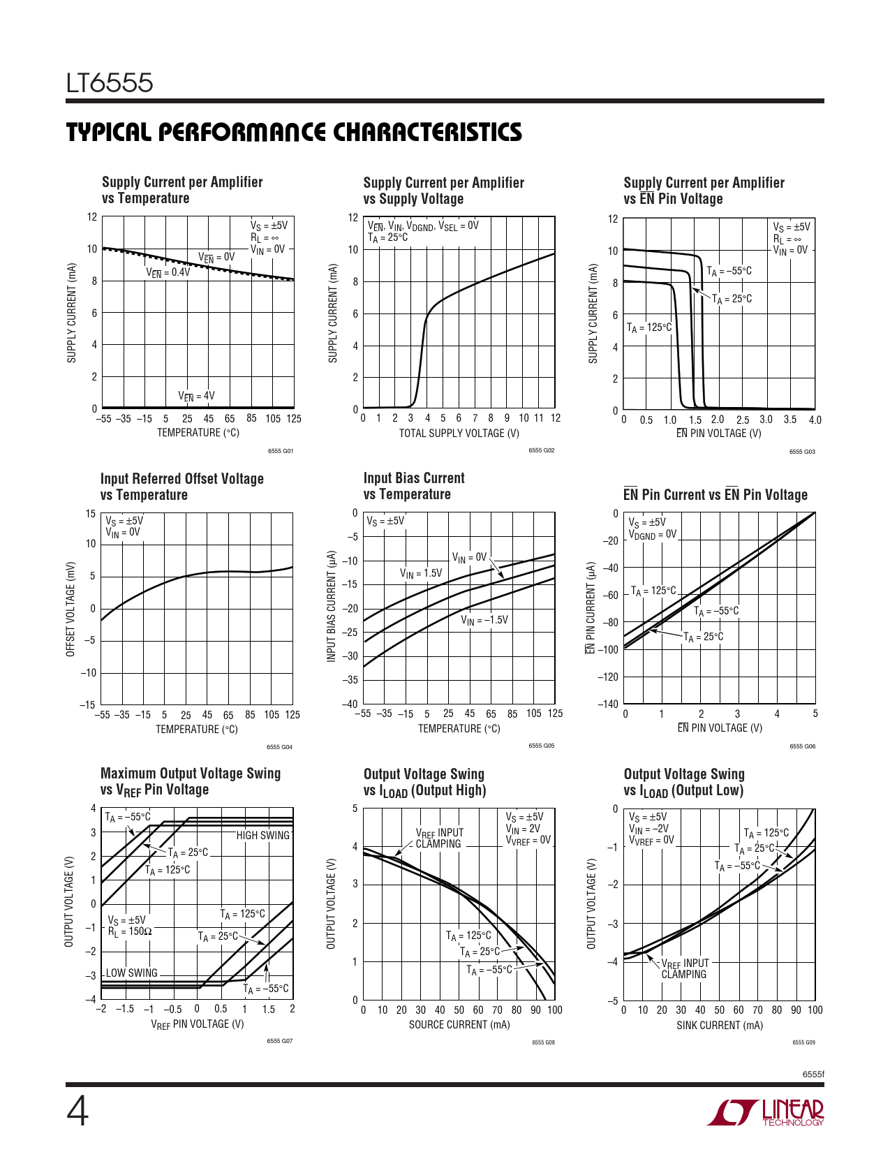 LT6555 WUTYPICAL PERFOR A CE CHARACTERISTICSSupply Current per AmplifierSupply Current per AmplifierSupply Current per Amplifiervs Temperaturevs Supply Voltagevs EN Pin Voltage 12 12 12 VS = ±5V VEN, VIN, VDGND, VSEL = 0V VS = ±5V RL = ∞ TA = 25°C RL = ∞ 10 VIN = 0V 10 10 V V IN = 0V EN = 0V V T EN = 0.4V A = –55°C 8 8 8 TA = 25°C 6 6 6 TA = 125°C 4 4 4 SUPPLY CURRENT (mA) SUPPLY CURRENT (mA) SUPPLY CURRENT (mA) 2 2 2 VEN = 4V 0 0 0 –55 –35 –15 5 25 45 65 85 105 125 0 1 2 3 4 5 6 7 8 9 10 11 12 0 0.5 1.0 1.5 2.0 2.5 3.0 3.5 4.0 TEMPERATURE (°C) TOTAL SUPPLY VOLTAGE (V) EN PIN VOLTAGE (V) 6555 G01 6555 G02 6555 G03 Input Referred Offset VoltageInput Bias Currentvs Temperaturevs TemperatureEN Pin Current vs EN Pin Voltage 15 0 0 VS = ±5V VS = ±5V VS = ±5V VIN = 0V –5 VDGND = 0V 10 –20 µA) –10 VIN = 0V –40 5 VIN = 1.5V µA) –15 –60 TA = 125°C 0 –20 TA = –55°C VIN = –1.5V –80 –25 –5 TA = 25°C OFFSET VOLTAGE (mV) EN PIN CURRENT ( –100 INPUT BIAS CURRENT ( –30 –10 –35 –120 –15 –40 –140 –55 –35 –15 5 25 45 65 85 105 125 –55 –35 –15 5 25 45 65 85 105 125 0 1 2 3 4 5 TEMPERATURE (°C) TEMPERATURE (°C) EN PIN VOLTAGE (V) 6555 G04 6555 G05 6555 G06 Maximum Output Voltage SwingOutput Voltage SwingOutput Voltage Swingvs VREF Pin Voltagevs ILOAD (Output High)vs ILOAD (Output Low) 4 5 0 TA = –55°C VS = ±5V VS = ±5V 3 V V HIGH SWING IN = 2V V IN = –2V REF INPUT TA = 125°C V V 4 VREF = 0V CLAMPING –1 VREF = 0V TA = 25°C 2 TA = 25°C T T A = 125°C A = –55°C 1 3 –2 0 T V A = 125°C S = ±5V –1 2 –3 RL = 150Ω TA = 25°C TA = 125°C OUTPUT VOLTAGE (V) OUTPUT VOLTAGE (V) OUTPUT VOLTAGE (V) –2 TA = 25°C 1 –4 V T REF INPUT –3 LOW SWING A = –55°C CLAMPING TA = –55°C –4 0 –5 –2 –1.5 –1 –0.5 0 0.5 1 1.5 2 0 10 20 30 40 50 60 70 80 90 100 0 10 20 30 40 50 60 70 80 90 100 VREF PIN VOLTAGE (V) SOURCE CURRENT (mA) SINK CURRENT (mA) 6555 G07 6555 G08 6555 G09 6555f 4