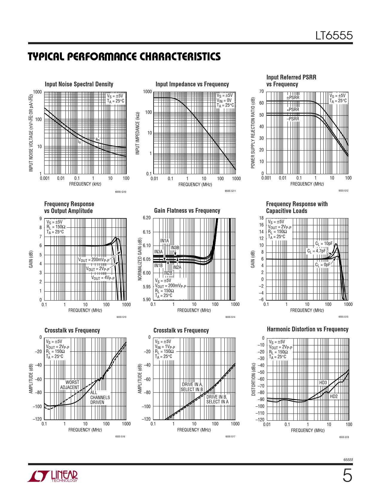 0 0 0 VS = ±5V VS = ±5V VS = ±5V V –10 OUT = 2VP-P VIN = 1VP-P VOUT = 2VP-P –20 RL = 150Ω –20 RL = 150Ω –20 RL = 150Ω TA = 25°C TA = 25°C –30 TA = 25°C –40 –40 –40 –50 –60 –60 –60 WORST HD3 DRIVE IN A, ADJACENT –70 SELECT IN B AMPLITUDE (dB) –80 ALL AMPLITUDE (dB) –80 DISTORTION (dBc) –80 CHANNELS DRIVE IN B, HD2 –90 DRIVEN SELECT IN A –100 –100 –100 –110 –120 –120 –120 0.1 1 10 100 1000 0.1 1 10 100 1000 0.01 0.1 1 10 100 FREQUENCY (MHz) FREQUENCY (MHz) FREQUENCY (MHz) 6555 G16 6555 G17 6555 G18 6555f 5