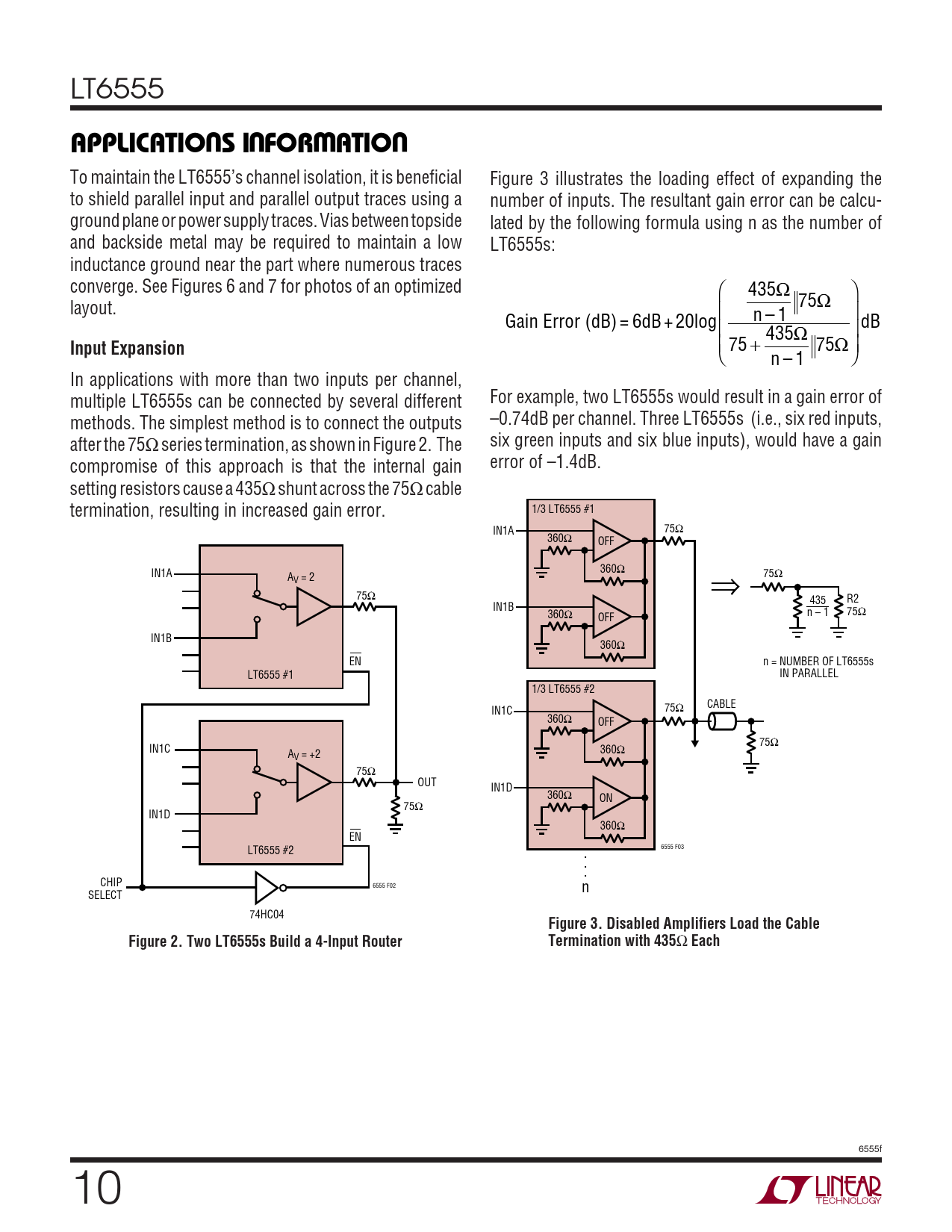 To maintain the LT6555’s channel isolation, it is beneficial Figure 3 illustrates the loading effect of expanding the to shield parallel input and parallel output traces using a number of inputs. The resultant gain error can be calcu- ground plane or power supply traces. Vias between topside lated by the following formula using n as the number of and backside metal may be required to maintain a low LT6555s: inductance ground near the part where numerous traces converge. See Figures 6 and 7 for photos of an optimized ⎛ 435Ω Ω ⎞ layout. ⎜ 75 ⎟ Gain Error (dB) = 6dB + 20log n – 1 dB ⎜ 435 ⎟