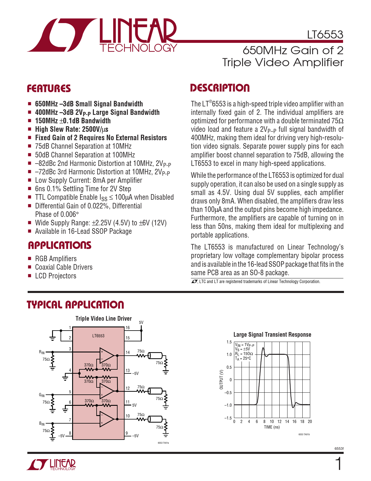 The LT6553 is manufactured on Linear Technology’s proprietary low voltage complementary bipolar process ■ RGB Amplifiers and is available in the 16-lead SSOP package that fits in the ■ Coaxial Cable Drivers same PCB area as an SO-8 package. ■ LCD Projectors , LTC and LT are registered trademarks of Linear Technology Corporation.