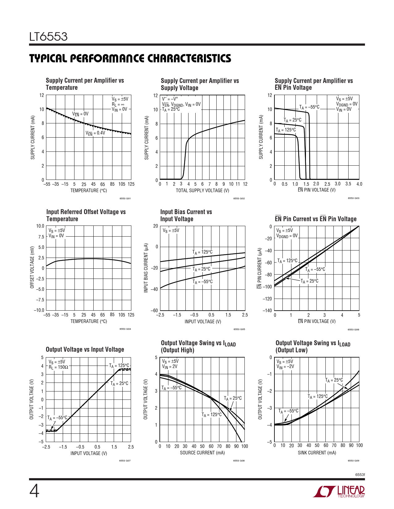LT6553 WUTYPICAL PERFOR A CE CHARACTERISTICSSupply Current per Amplifier vsSupply Current per Amplifier vsSupply Current per Amplifier vsTemperatureSupply VoltageEN Pin Voltage 12 12 12 VS = ±5V V– = –V+ VS = ±5V RL = ∞ V V EN, VDGND, VIN = 0V DGND = 0V T 10 V A = –55°C IN = 0V 10 TA = 25°C 10 VIN = 0V VEN = 0V TA = 25°C 8 8 8 TA = 125°C VEN = 0.4V 6 6 6 4 4 4 SUPPLY CURRENT (mA) SUPPLY CURRENT (mA) SUPPLY CURRENT (mA) 2 2 2 0 0 0 –55 –35 –15 5 25 45 65 85 105 125 0 1 2 3 4 5 6 7 8 9 10 11 12 0 0.5 1.0 1.5 2.0 2.5 3.0 3.5 4.0 TEMPERATURE (°C) TOTAL SUPPLY VOLTAGE (V) EN PIN VOLTAGE (V) 6553 G01 6553 G02 6553 G03 Input Referred Offset Voltage vsInput Bias Current vsTemperatureInput VoltageEN Pin Current vs EN Pin Voltage 10.0 20 0 V V S = ±5V S = ±5V VS = ±5V V V 7.5 IN = 0V –20 DGND = 0V 5.0 µA) 0 T –40 A = 125°C µA) 2.5 –60 TA = 125°C 0 –20 TA = 25°C TA = –55°C –80 –2.5 TA = –55°C TA = 25°C OFFSET VOLTAGE (mV) EN PIN CURRENT ( –100 –5.0 INPUT BIAS CURRENT ( –40 –120 –7.5 –10.0 –60 –140 –55 –35 –15 5 25 45 65 85 105 125 –2.5 –1.5 –0.5 0.5 1.5 2.5 0 1 2 3 4 5 TEMPERATURE (°C) INPUT VOLTAGE (V) EN PIN VOLTAGE (V) 6553 G04 6553 G05 6553 G06 Output Voltage Swing vs ILOADOutput Voltage Swing vs ILOADOutput Voltage vs Input Voltage(Output High)(Output Low) 5 5 0 VS = ±5V VS = ±5V VS = ±5V 4 RL = 150Ω TA = 125°C VIN = 2V VIN = –2V 3 4 –1 T 2 A = 25°C TA = 25°C TA = –55°C 1 3 –2 TA = 125°C 0 TA = 25°C –1 2 –3 TA = –55°C –2 TA = 125°C OUTPUT VOLTAGE (V) TA = –55°C OUTPUT VOLTAGE (V) OUTPUT VOLTAGE (V) –3 1 –4 –4 –5 0 –5 –2.5 –1.5 –0.5 0.5 1.5 2.5 0 10 20 30 40 50 60 70 80 90 100 0 10 20 30 40 50 60 70 80 90 100 INPUT VOLTAGE (V) SOURCE CURRENT (mA) SINK CURRENT (mA) 6553 G07 6553 G08 6553 G09 6553f 4