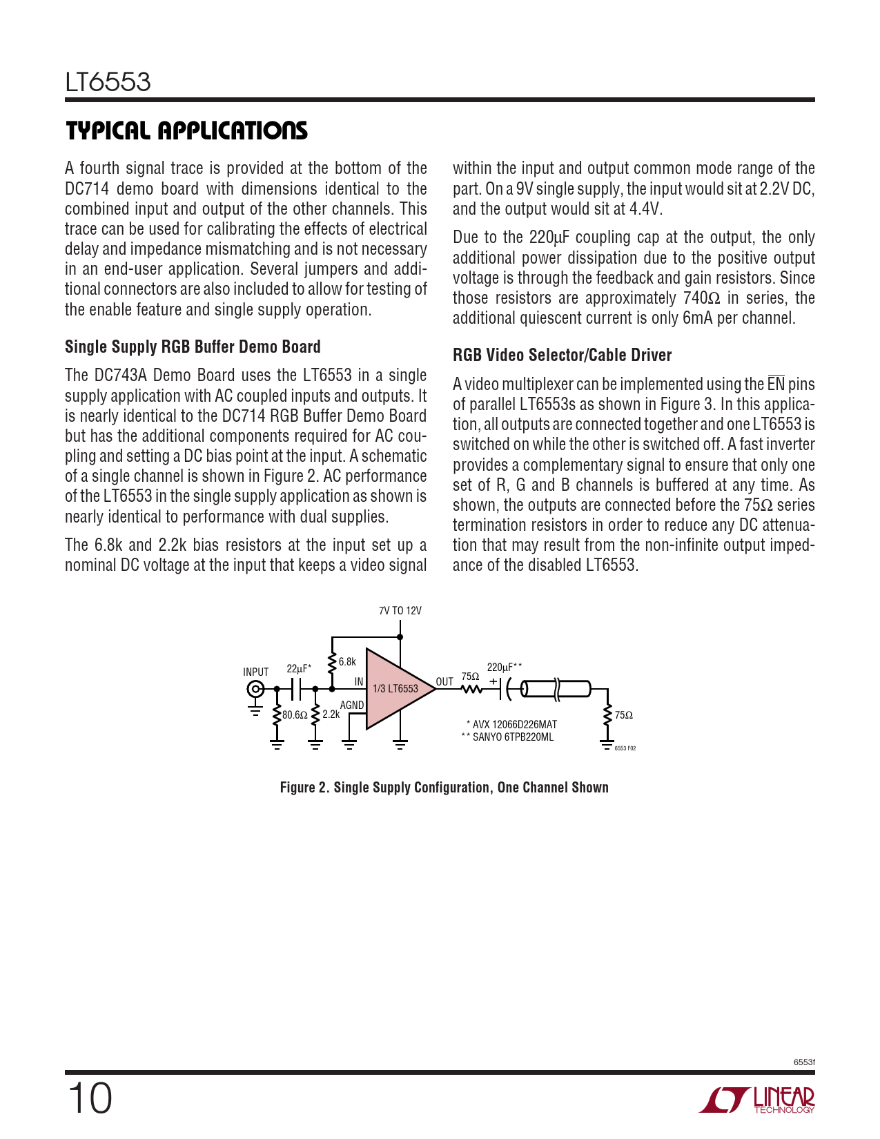 The DC743A Demo Board uses the LT6553 in a single A video multiplexer can be implemented using the EN pins supply application with AC coupled inputs and outputs. It of parallel LT6553s as shown in Figure 3. In this applica- is nearly identical to the DC714 RGB Buffer Demo Board tion, all outputs are connected together and one LT6553 is but has the additional components required for AC cou- switched on while the other is switched off. A fast inverter pling and setting a DC bias point at the input. A schematic provides a complementary signal to ensure that only one of a single channel is shown in Figure 2. AC performance set of R, G and B channels is buffered at any time. As of the LT6553 in the single supply application as shown is shown, the outputs are connected before the 75Ω series nearly identical to performance with dual supplies. termination resistors in order to reduce any DC attenua- The 6.8k and 2.2k bias resistors at the input set up a tion that may result from the non-infinite output imped- nominal DC voltage at the input that keeps a video signal ance of the disabled LT6553. 7V TO 12V 6.8k 22µF* 220µF** INPUT 75Ω + IN OUT 1/3 LT6553 AGND 80.6Ω 2.2k 75Ω * AVX 12066D226MAT ** SANYO 6TPB220ML 6553 F02