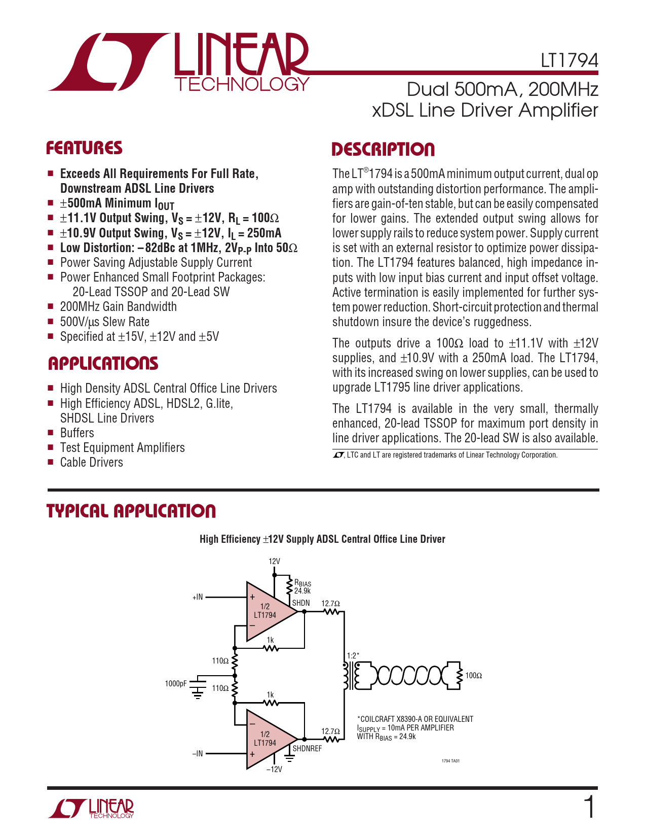 LT1794 Dual 500mA, 200MHz xDSL Line Driver Amplifier