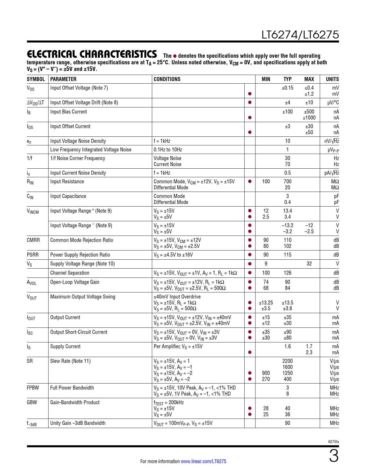 LT6274/LT6275 ELECTRICAL CHARACTERISTICSThe l denotes the specifications which apply over the full operatingtemperature range, otherwise specifications are at TA = 25°C. Unless noted otherwise, VCM = 0V, and specifications apply at bothVS = (V+ – V–) = ±5V and ±15V. SYMBOL PARAMETERCONDITIONSMINTYPMAXUNITS VOS Input Offset Voltage (Note 7) ±0.15 ±0.4 mV l ±1.2 mV ∆VOS/∆T Input Offset Voltage Drift (Note 8) l ±4 ±10 µV/°C IB Input Bias Current ±100 ±500 nA l ±1000 nA IOS Input Offset Current ±3 ±30 nA l ±50 nA en Input Voltage Noise Density f = 1kHz 10 nV/√Hz Low Frequency Integrated Voltage Noise 0.1Hz to 10Hz 1 µVP-P 1/f 1/f Noise Corner Frequency Voltage Noise 30 Hz Current Noise 70 Hz in Input Current Noise Density f = 1kHz 0.5 pA/√Hz RIN Input Resistance Common Mode, VCM = ±12V, VS = ±15V l 100 700 MΩ Differential Mode 20 MΩ CIN Input Capacitance Common Mode 3 pF Differential Mode 0.4 pF VINCM Input Voltage Range + (Note 9) VS = ±15V l 12 13.4 V VS = ±5V l 2.5 3.4 V Input Voltage Range – (Note 9) VS = ±15V l –13.2 –12 V VS = ±5V l –3.2 –2.5 V CMRR Common Mode Rejection Ratio VS = ±15V, VCM = ±12V l 90 110 dB VS = ±5V, VCM = ±2.5V l 80 102 dB PSRR Power Supply Rejection Ratio VS = ±4.5V to ±16V l 90 115 dB VS Supply Voltage Range (Note 10) l 9 32 V Channel Separation VS = ±15V, VOUT = ±1V, AV = 1, RL = 1kΩ l 100 126 dB AVOL Open-Loop Voltage Gain VS = ±15V, VOUT = ±12V, RL = 1kΩ l 74 90 dB VS = ±5V, VOUT = ±2.5V, RL = 500Ω l 68 84 dB VOUT Maximum Output Voltage Swing ±40mV Input Overdrive VS = ±15V, RL = 1kΩ l ±13.25 ±13.5 V VS = ±5V, RL = 500Ω l ±3.5 ±3.8 V IOUT Output Current VS = ±15V, VOUT = ±12V, VIN = ±40mV l ±15 ±35 mA VS = ±5V, VOUT = ±2.5V, VIN = ±40mV l ±12 ±30 mA ISC Output Short-Circuit Current VS = ±15V, VOUT = 0V, VIN = ±3V l ±35 ±90 mA VS = ±5V, VOUT = 0V, VIN = ±3V l ±30 ±80 mA IS Supply Current Per Amplifier, VS = ±15V 1.6 1.7 mA l 2.3 mA SR Slew Rate (Note 11) VS = ±15V, AV = 1 2200 V/µs VS = ±15V, AV = –1 1600 V/µs VS = ±15V, AV = –2 l 900 1250 V/µs VS = ±5V, AV = –2 l 270 400 V/µs FPBW Full Power Bandwidth VS = ±15V, 10V Peak, AV = –1, <1% THD 3 MHz VS = ±5V, 1V Peak, AV = –1, <1% THD 8 MHz GBW Gain-Bandwidth Product fTEST = 200kHz VS = ±15V l 28 40 MHz VS = ±5V l 25 36 MHz f–3dB Unity Gain –3dB Bandwidth VOUT = 100mVP-P, VS = ±15V 90 MHz 6275fa For more information www.linear.com/LT6275 3